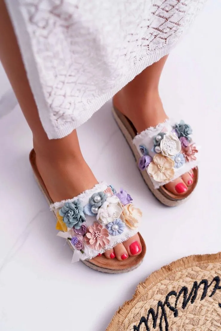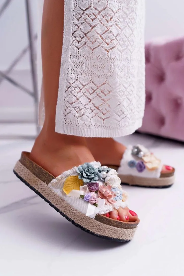 Hot Boto Klapki Damskie Z Kwiatami Gruba Podeszwa Białe Amadeo