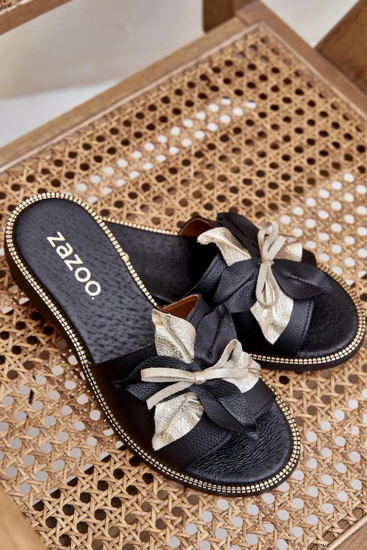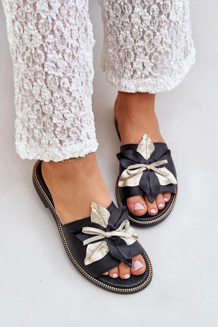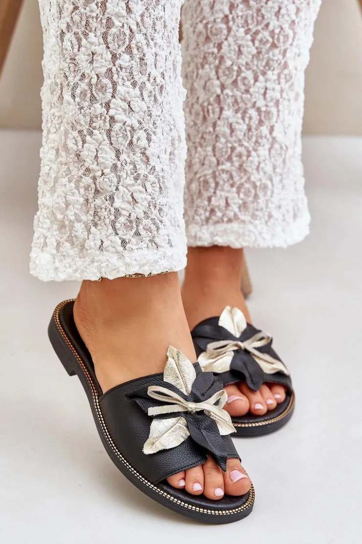 Damskie klapki ze skóry naturalnej stanowią znakomity wybór dla kobiet poszukujących połączenia elegancji z komfortem. Płaski obcas, zapewnia wygodę użytkowania przez cały dzień. Ozdoba nadaje im niepowtarzalny urok i elegancję. Model ten to idealny wybór zarówno do eleganckich stylizacji biurowych, jak i na codzienne wyjścia! Przy wyborze rozmiaru prosimy sugerować się tabelą rozmiarów.