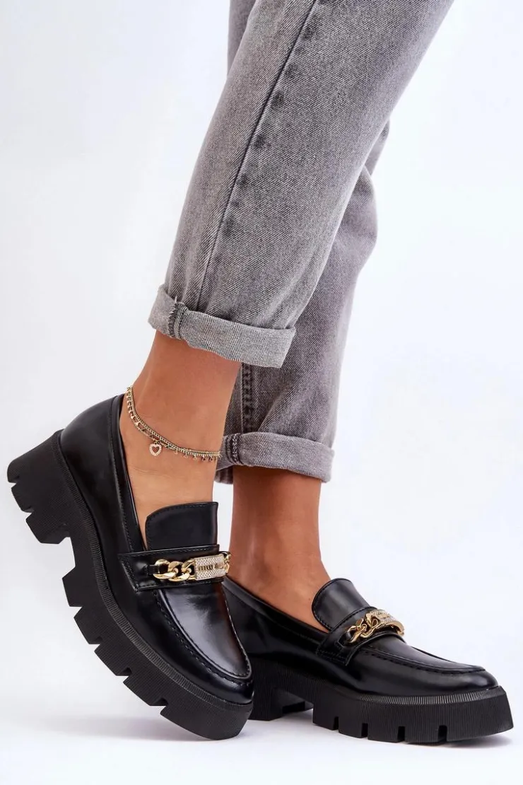 Te modne, damskie mokasyny świetnie sprawdzą się do wielu stylizacji! Osadzono je na masywnej platformie i płaskim obcasie. Mokasyny posiadają delikatnie usztywniany zapiętek oraz wkładkę z eko skóry. Na pasku z przodu znajduje się łańcuszek z ozdobną blaszką z dżetami. Koniecznie powinnaś mieć ten model! Przy wyborze rozmiaru prosimy sugerować się tabelą rozmiarów.