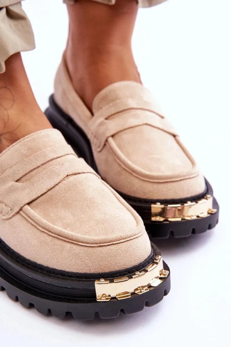 Klasyczne mokasyny zostały wykonane z ekologicznego zamszu. Na przodzie platformy posiadają ozdobne elementy. Osadzone na płaskim obcasie. Podeszwa z tworzywa sztucznego ze żłobieniami świetnie odizoluje od nierównego podłoża. Model wsuwany z usztywnianym zapiętkiem. Koniecznie powinnaś je mieć! Przy wyborze rozmiaru prosimy sugerować się tabelą rozmiarów.