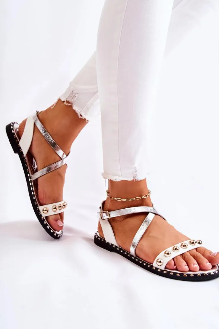 Modne, a zarazem wygodne sandały na płaskim obcasie zostały wykonane z eko skóry. Posiadają dekoracyjne zdobienia wokół podeszwy. Modny fason z przeplatającymi się paskami. Wkładka jest także wykonana z eko skóry z dodatkowym pikowaniem. Model zapinany wokół kostki na regulowany pasek ze sprzączką. Ozdoby w postaci dżetów znajdują się na przednim pasku obuwia. Podeszwa wykonana z gumowego tworzywa, antypoślizgowa. Przy wyborze rozmiaru prosimy kierować się tabelą rozmiarów.