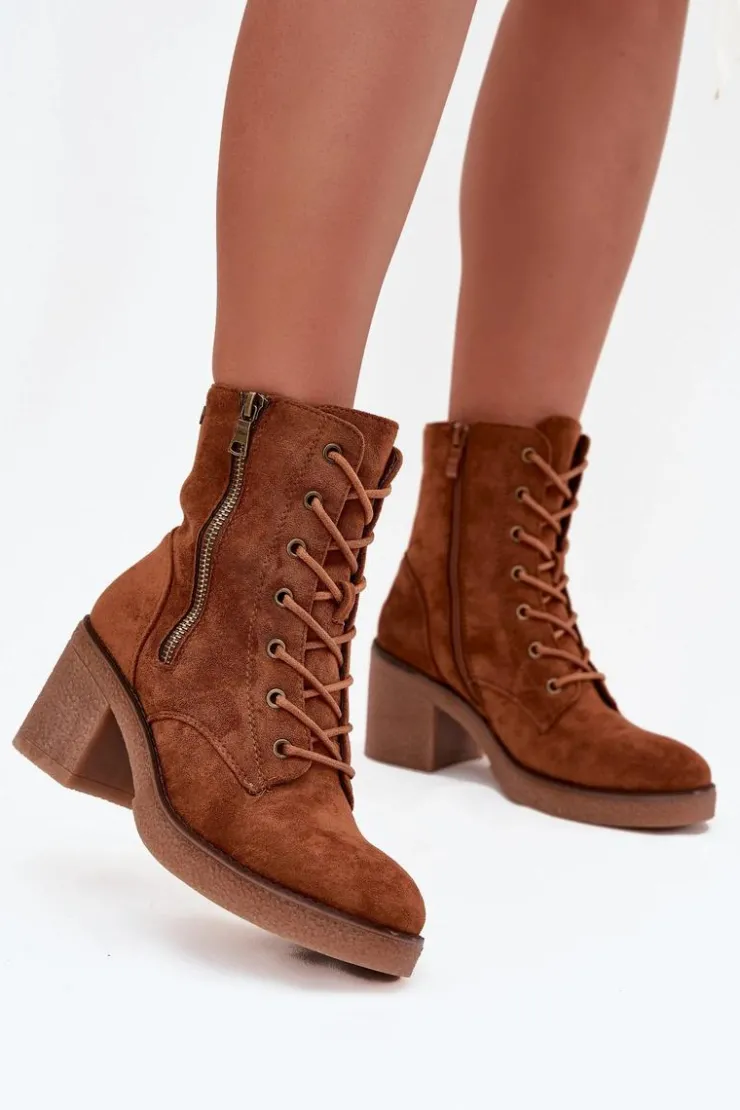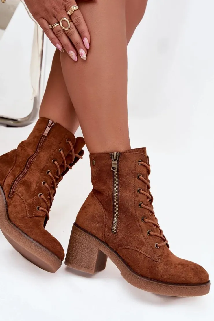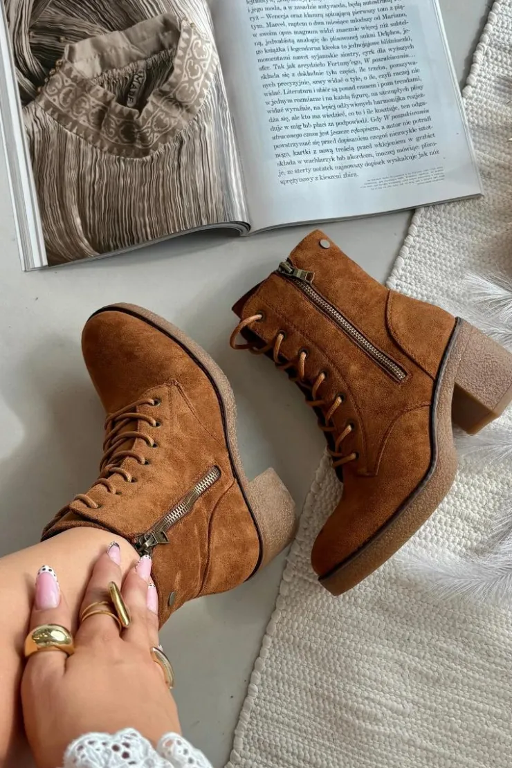 Botki damskie wykonane z eko zamszu. Osadzone na stabilnym obcasie typu słupek, subtelnie podkreślają sylwetkę, a dzięki sznurowaniu można je idealnie dopasować do stopy. Posiadają zapięcie na zamek, co ułatwia zakładanie oraz dodatkowy ozdobny suwak, który nadaje całości modnego charakteru. Wnętrze butów zostało ocieplone kocem obuwniczym, co gwarantuje komfort termiczny w chłodniejsze dni. To idealny wybór do codziennych i casualowych stylizacji.