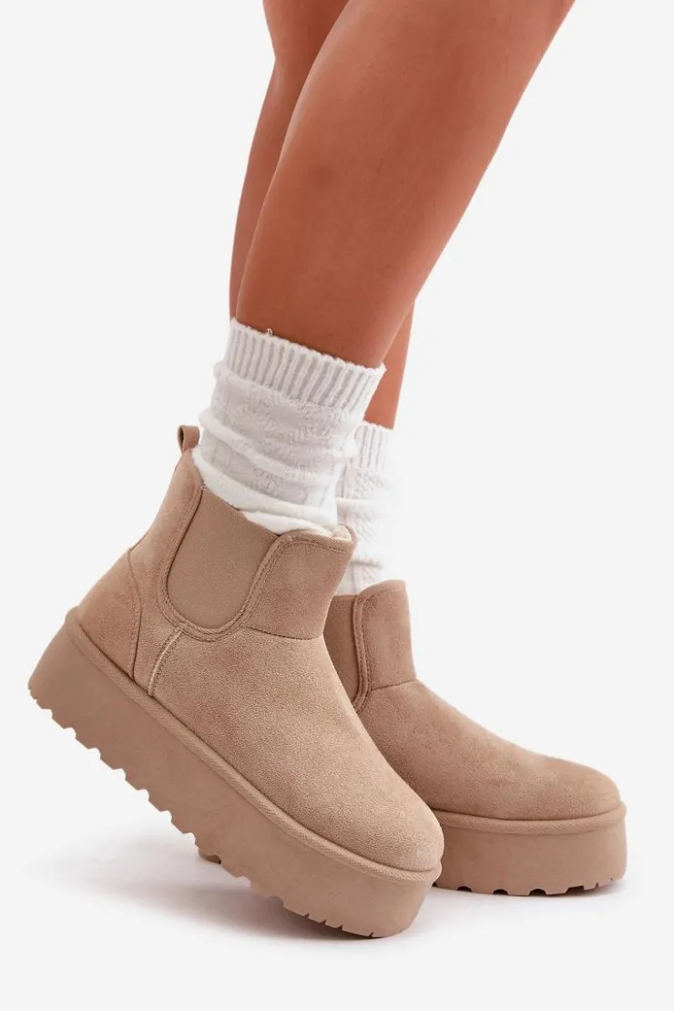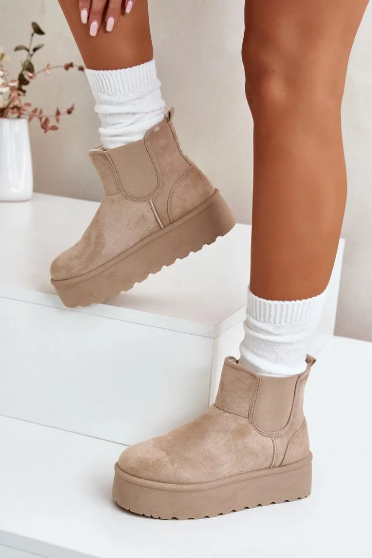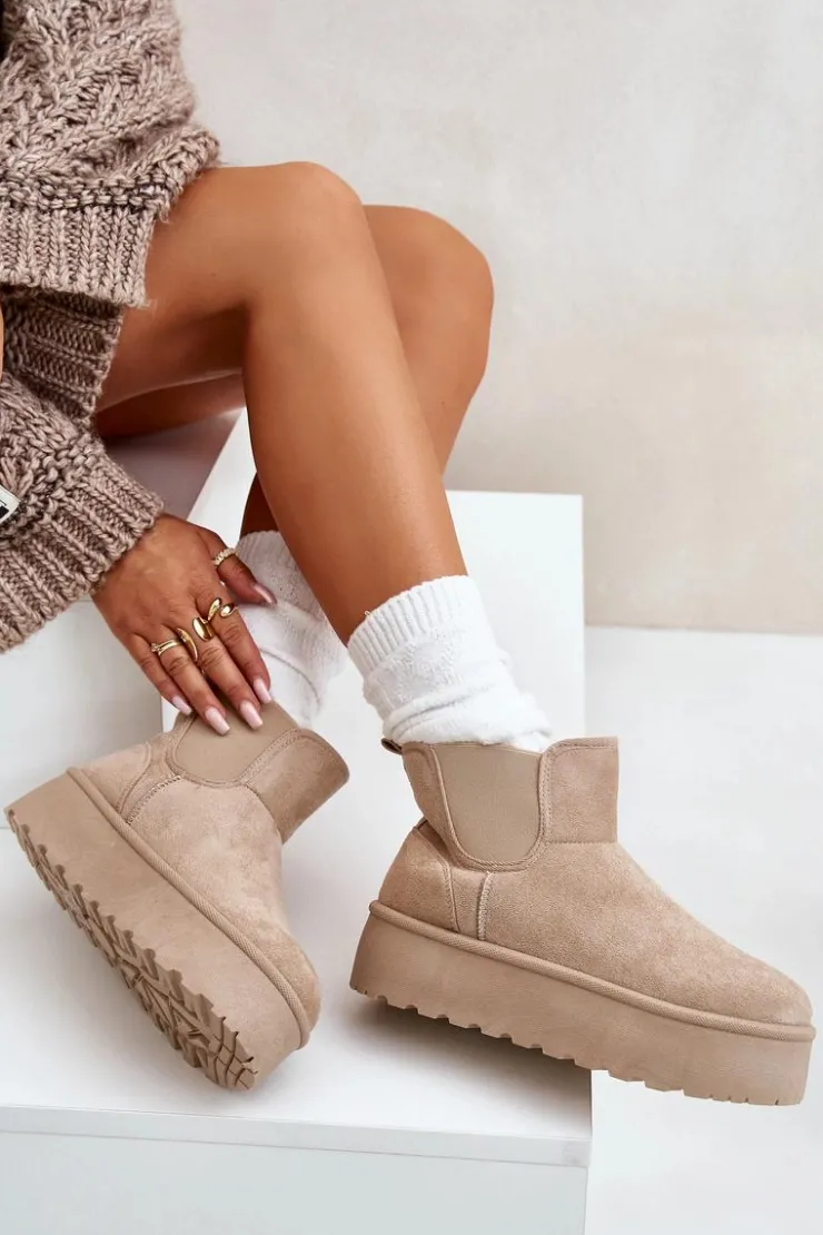Modne śniegowce damskie osadzone na platformie, która świetnie odizoluje od zimnego podłoża. Wykonane z eko zamszu. Model z niską cholewką, która wzbogacona została elastycznymi wstawkami. Środek ocieplony grubym futerkiem. Ten modny fason dopasujesz do niemalże każdej stylizacji! Przy wyborze rozmiaru prosimy sugerować się tabelą rozmiarów.