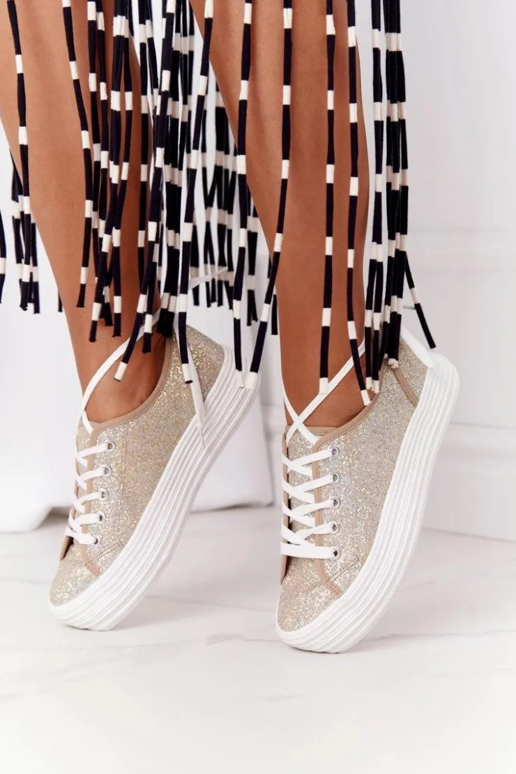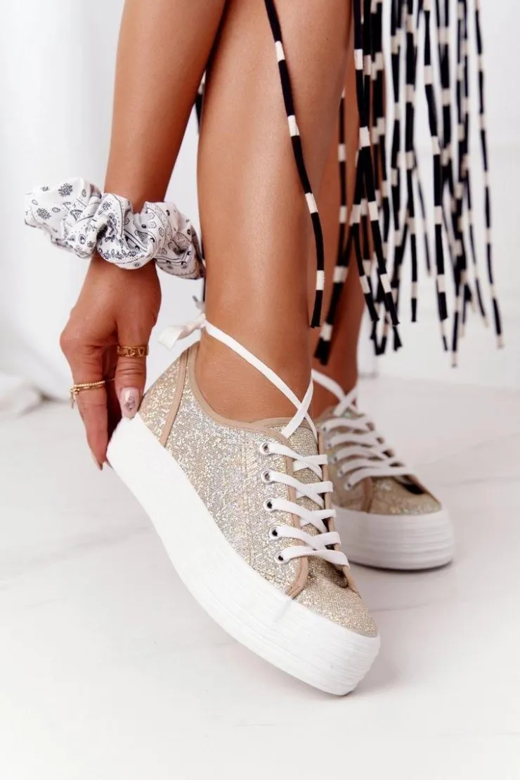 Damskie tenisówki na platformie ozdobione kolorowym brokatem. Tenisówki posiadają miękką, materiałową wkładkę oraz antypoślizgową podeszwę. Przy wyborze rozmiaru prosimy sugerować się tabelą rozmiarów.