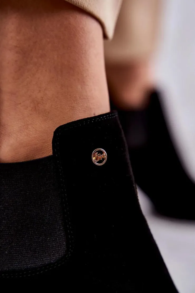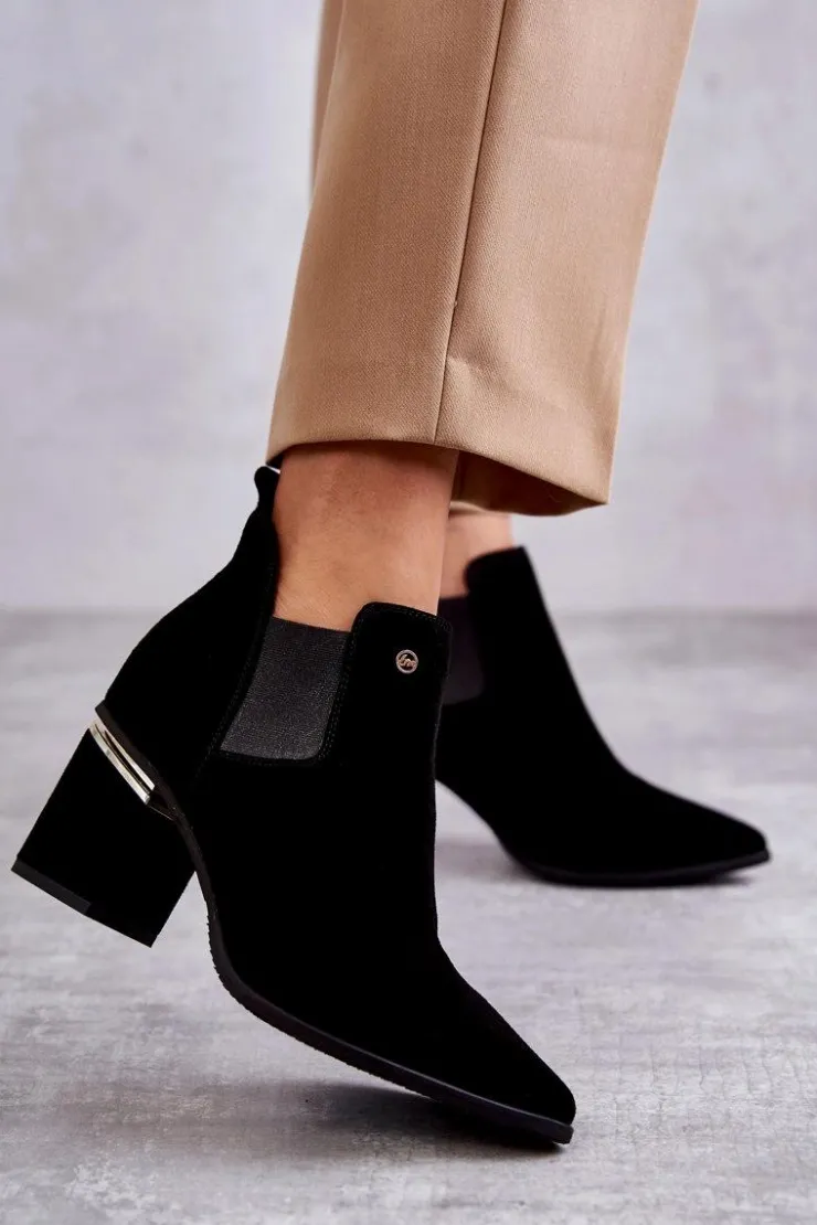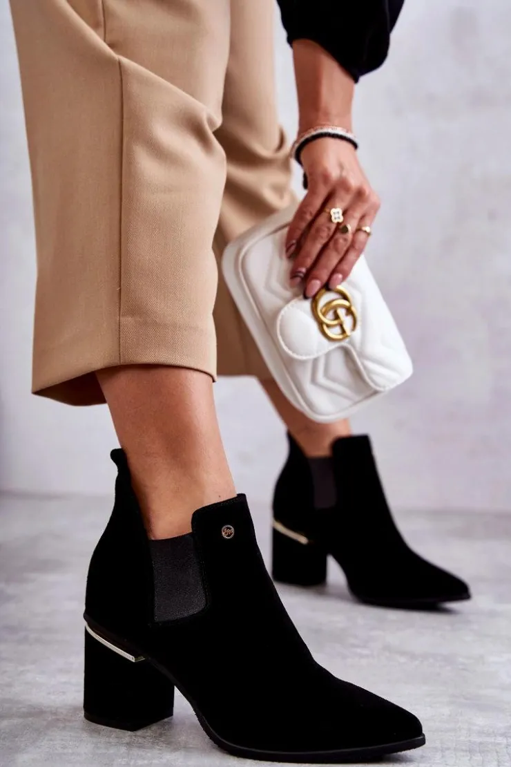 Eleganckie botki świetnie sprawdzą się podczas tworzenia stylizacji w chłodniejsze dni. Botki są wsuwane, z elastycznymi gumkami po bokach cholewki. W całości wykonane z naturalnego zamszu. Atutami tych botków jest przede wszystkim komfort noszenia oraz wysoka jakość wykonania. Dodatkowo posiadają usztywniany zapiętek oraz ozdobny obcas w postaci słupka. Przy wyborze rozmiaru prosimy sugerować się tabelą rozmiarów.