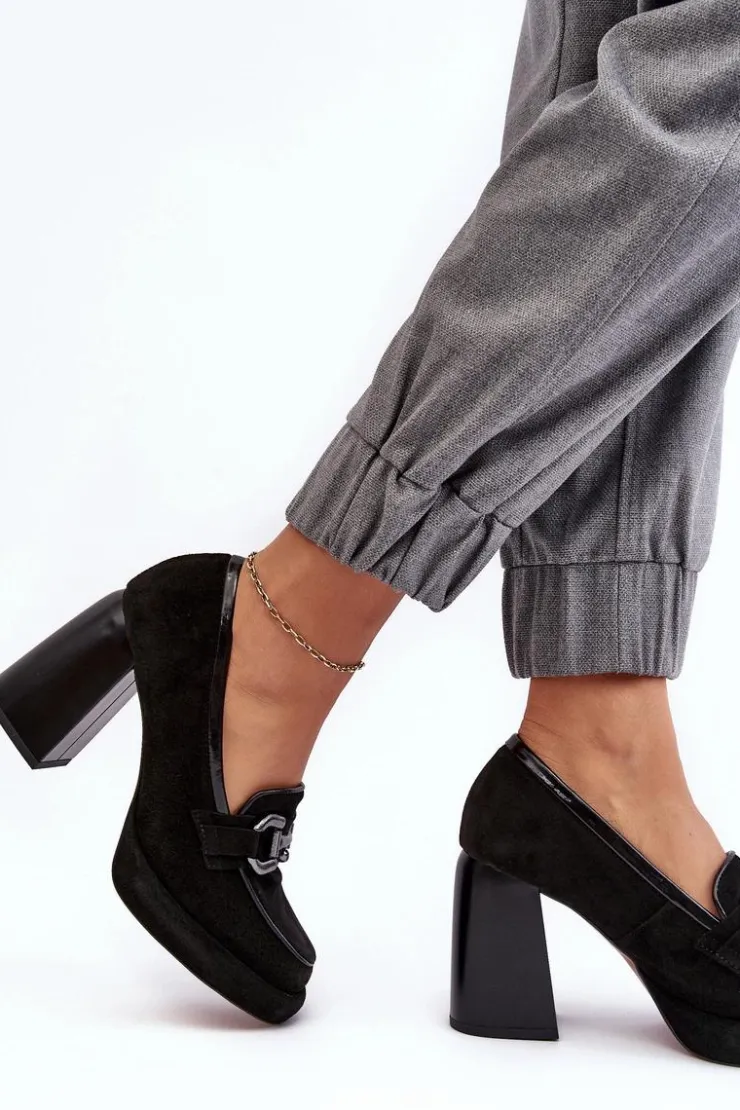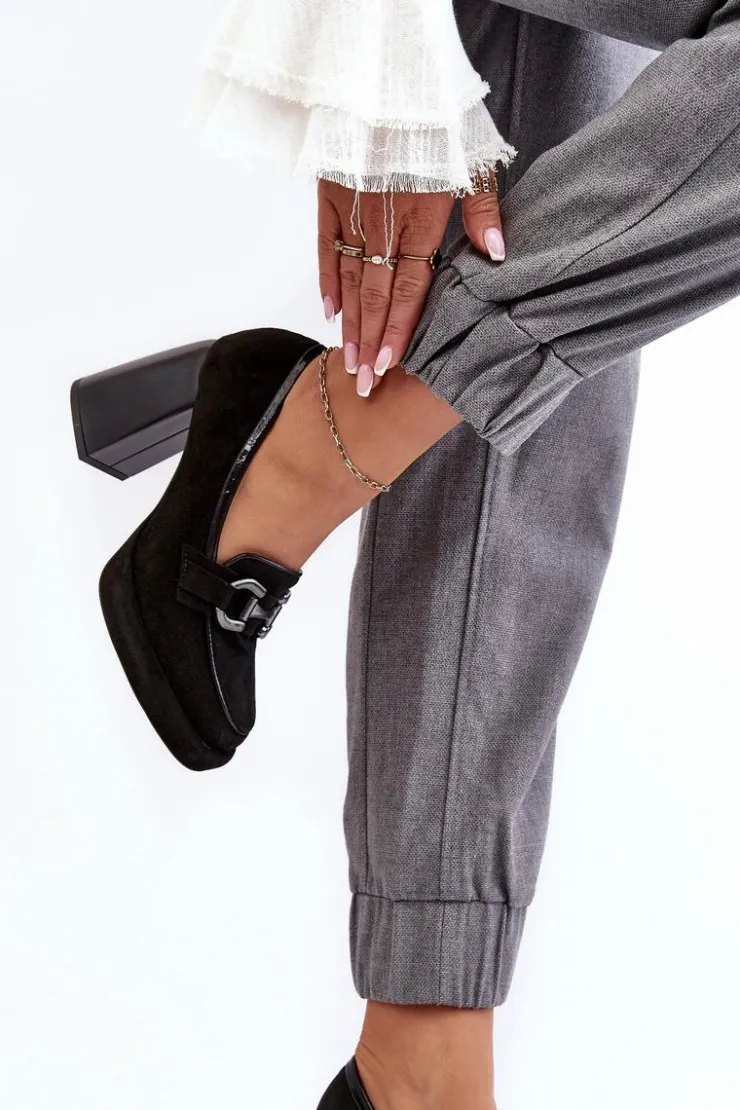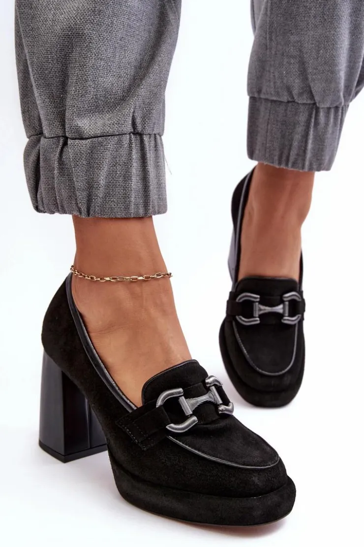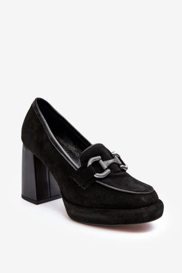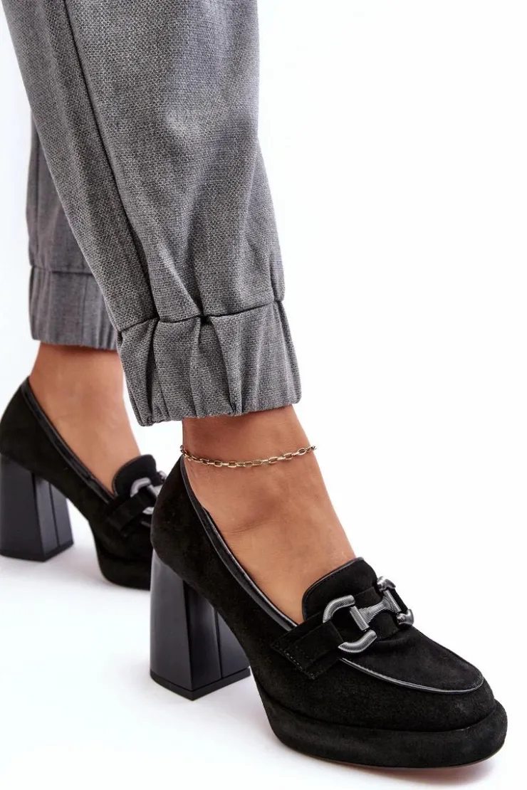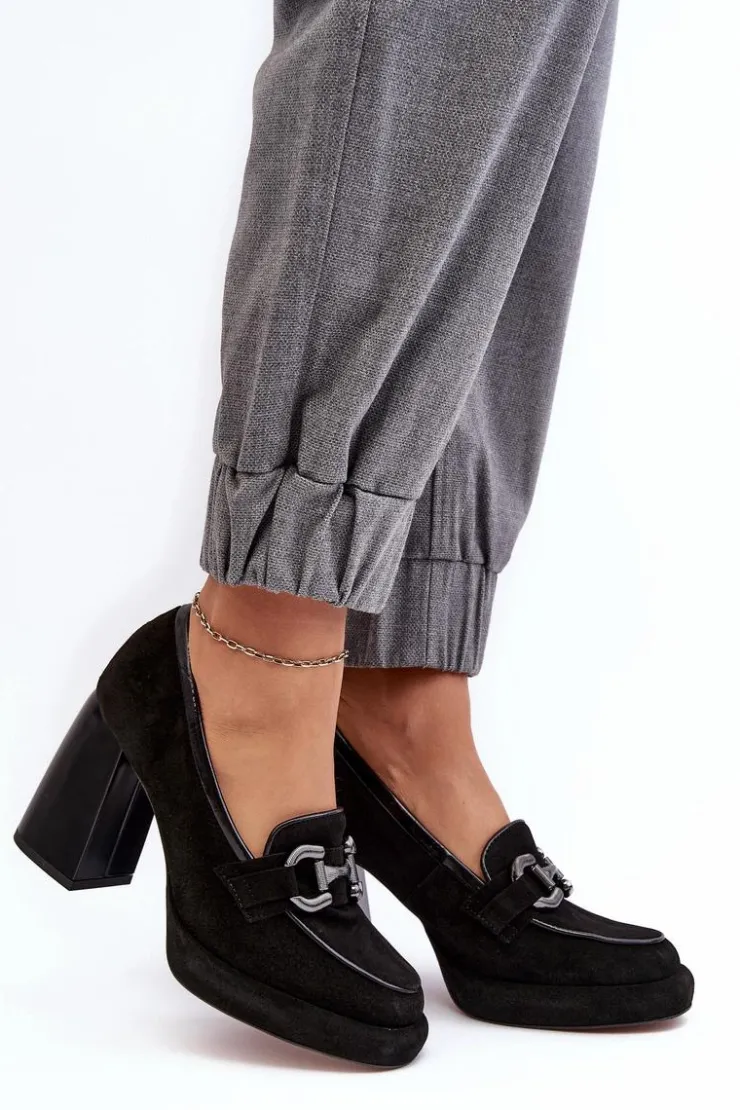 Czółenka damskie wykonane zostały z wysokiej jakości naturalnej skóry. Osadzone na platformie i masywnym obcasie w postaci słupka. Miękka, skórzana wkładka zapewni komfort podczas użytkowania. Noski zaokrąglone. Zapiętek usztywniony. Z przodu ozdoba z tworzywa sztucznego. Przy wyborze rozmiaru prosimy sugerować się tabelą rozmiarów.