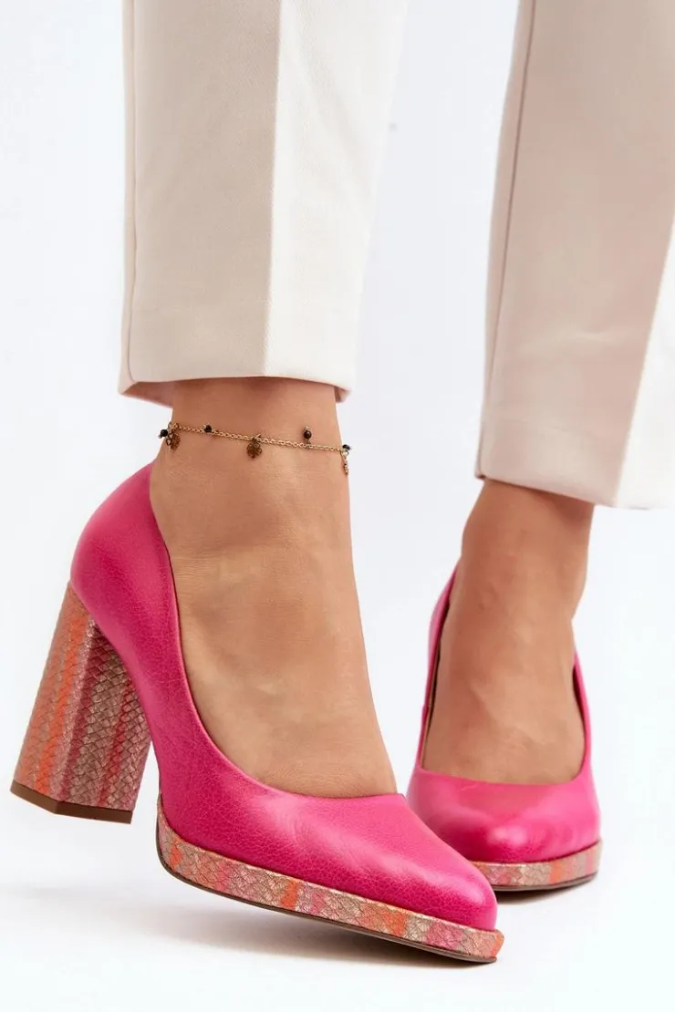 Stylowe czółenka wykonane zostały z wysokiej jakości naturalnej skóry. Osadzone na obcasie w postaci słupka. Noski zaokrąglone. Miękka wkładka oraz stabilny obcas zadbają o Twój komfort. Czółenka posiadają usztywniany zapiętek. Przy wyborze rozmiaru prosimy sugerować się tabelą rozmiarów.
