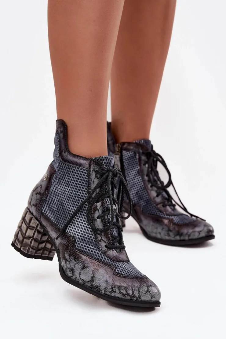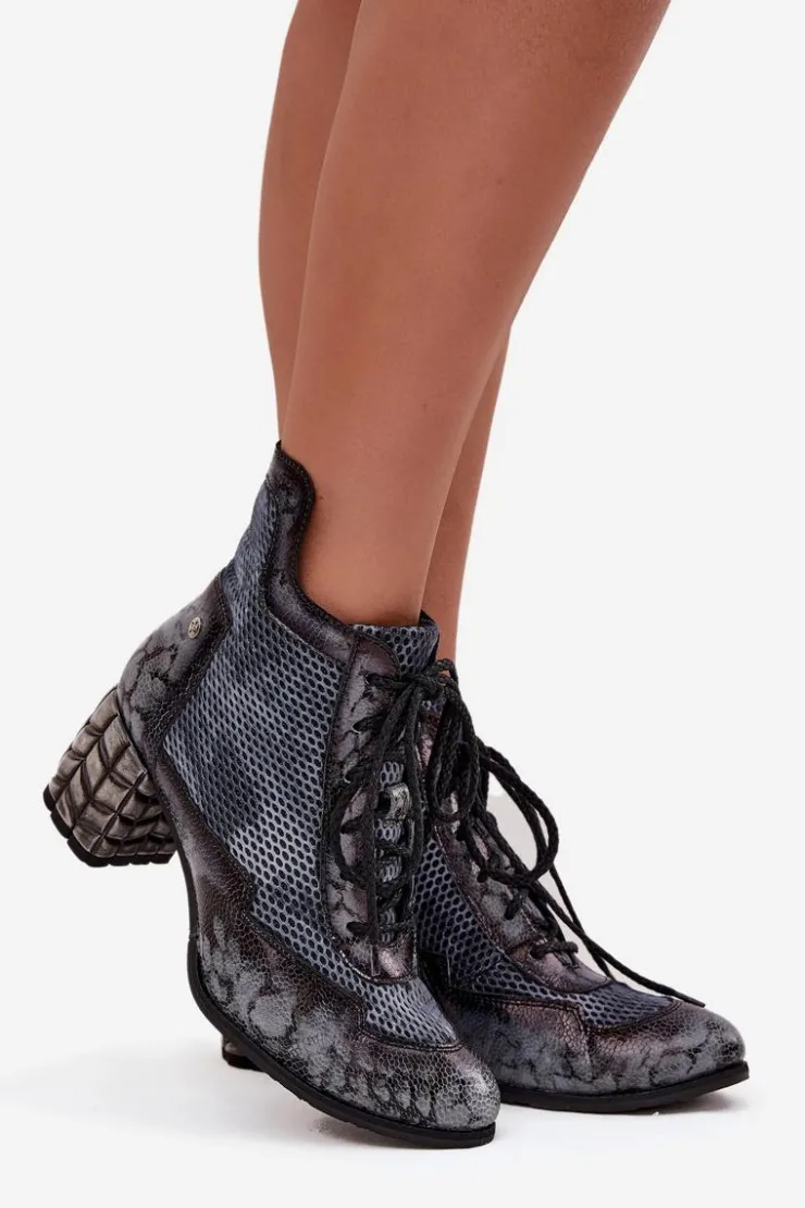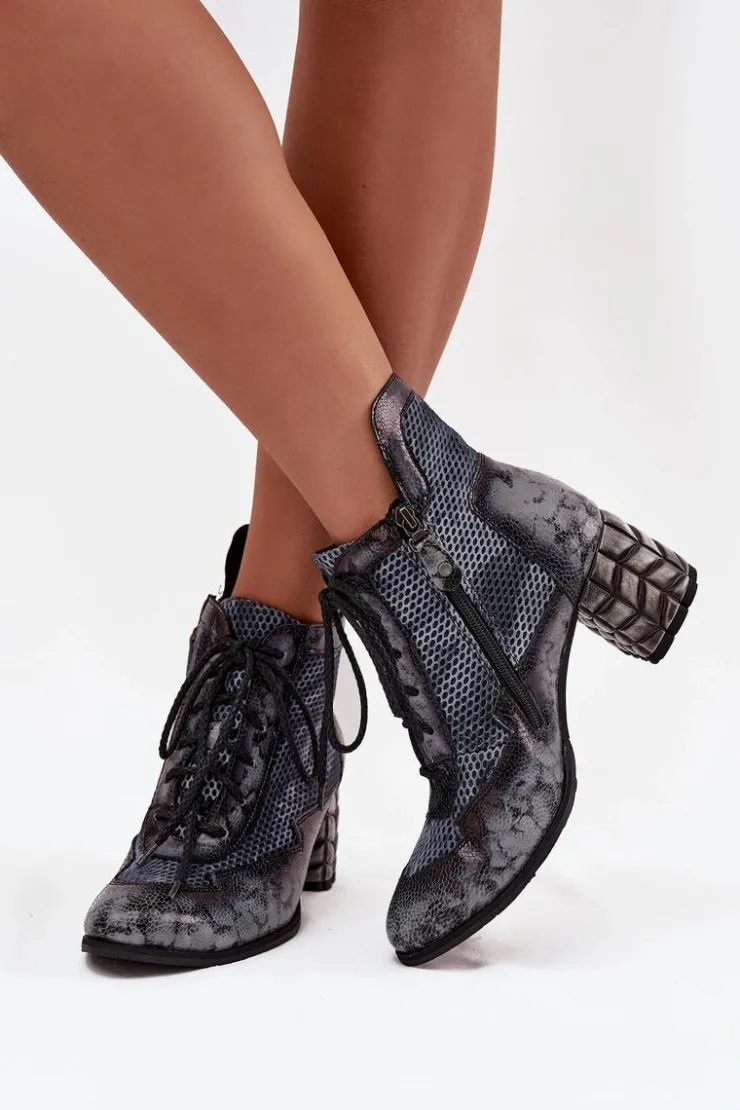 Botki damskie marki Maciejka wykonane z naturalnej skóry to propozycja dla kobiet ceniących wysoką jakość i unikalny styl. Model wyróżnia się oryginalnym wyglądem, który przyciąga uwagę i dodaje charakteru każdej stylizacji. Osadzone na stabilnym obcasie typu słupek, zapewniają wygodę noszenia oraz subtelne wysmuklenie sylwetki. Połączenie sznurowania i praktycznego zamka sprawia, że buty można łatwo dopasować do stopy. To eleganckie, a zarazem funkcjonalne botki, które świetnie sprawdzą się w sezonie jesienno-zimowym. Przy wyborze rozmiaru prosimy sugerować się tabelą rozmiarów.