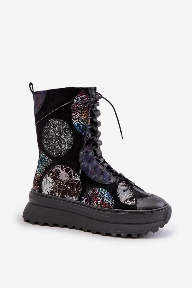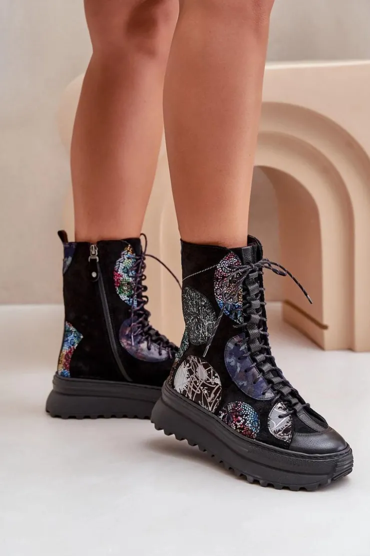 Botki marki Maciejka wykonane z naturalnego zamszu to stylowy wybór na chłodniejsze dni. Osadzone na platformie, wyróżniają się ozdobnymi elementami na cholewce, które dodają im charakteru. Model zapinany na zamek i sznurowany, zapewnia wygodne dopasowanie. Ocieplane wnętrze gwarantuje ciepło i komfort podczas noszenia, dzięki czemu idealnie sprawdzą się w jesienno-zimowych stylizacjach. Przy wyborze rozmiaru prosimy sugerować się tabelą rozmiarów.