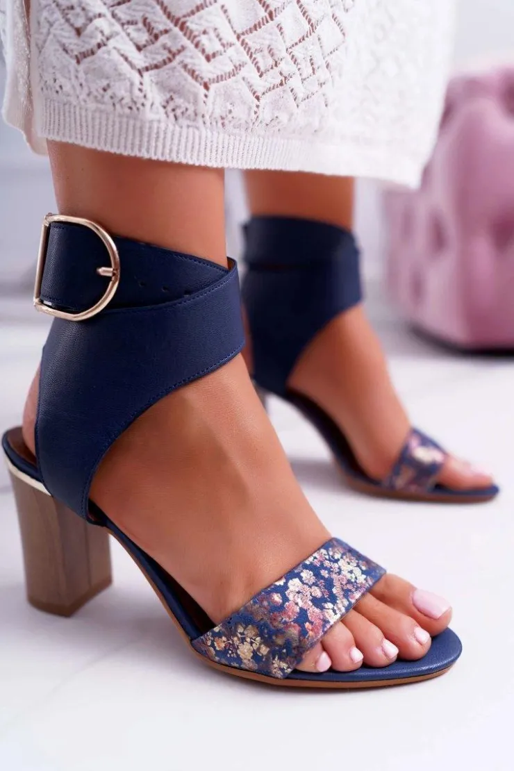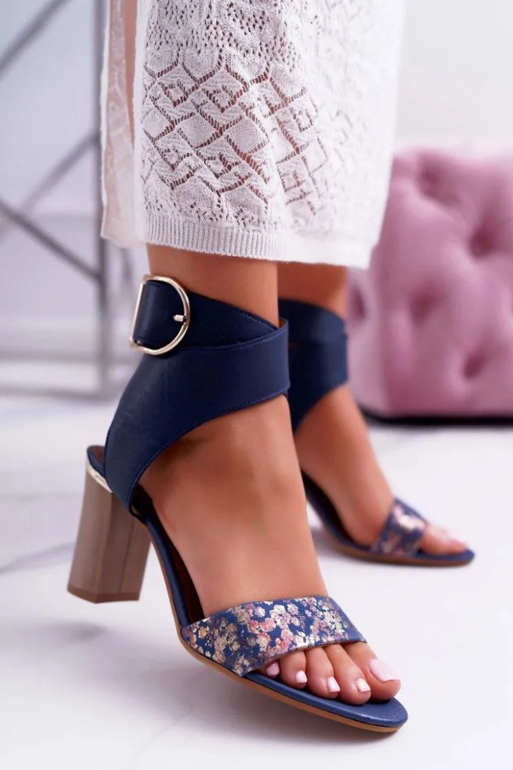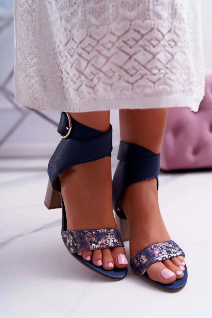 Maciejka Sandały Na Obcasie*Skórzane Damskie Sandały Na Słupku Granatowe 03597