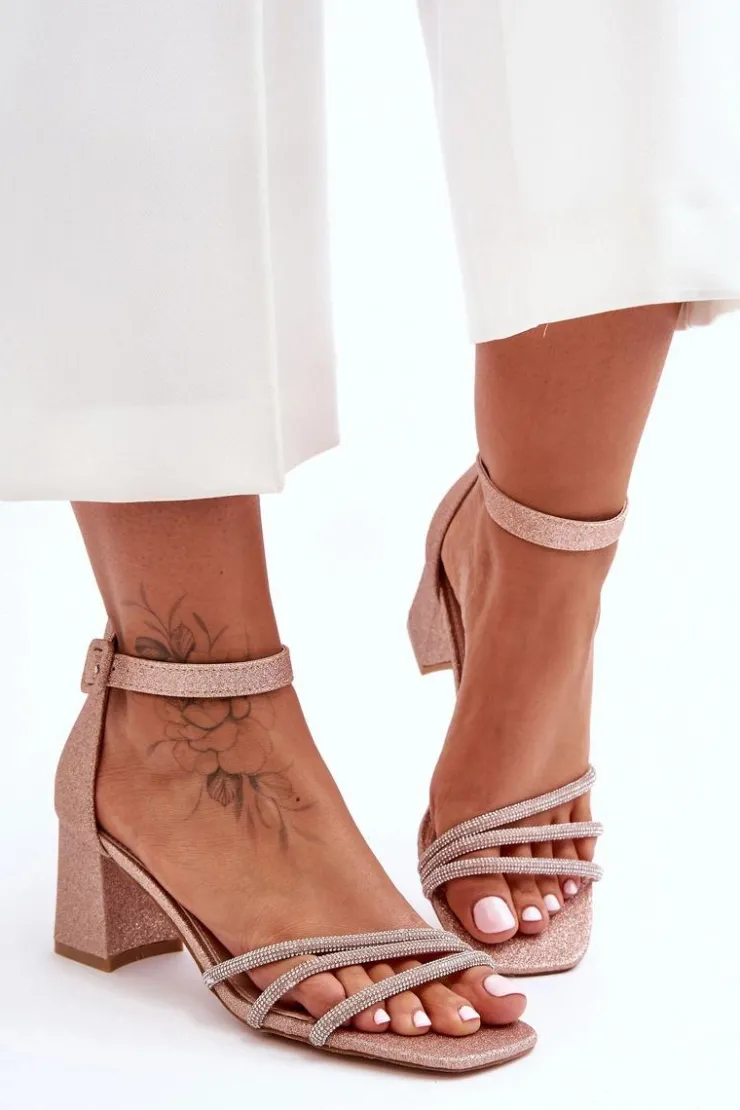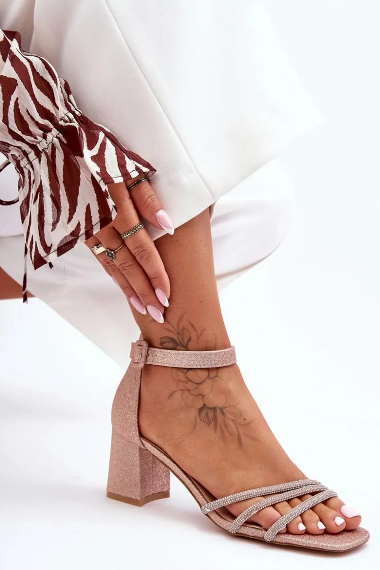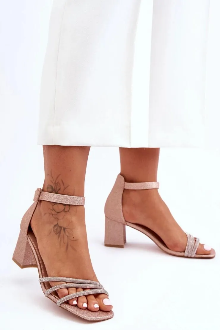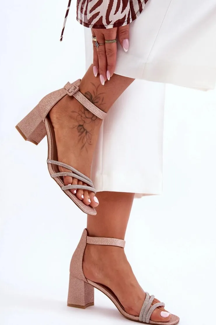 Klasyczne, błyszczące damskie sandałki na niskim obcasie w postaci słupka. Z przodu zdobione małymi cyrkoniami. Zapinane wokół kostki na regulowany pasek ze sprzączką. Idealne na różnego rodzaju imprezy! Koniecznie powinnaś je mieć w swojej szafie! Przy wyborze rozmiaru prosimy kierować tabelą rozmiarów.