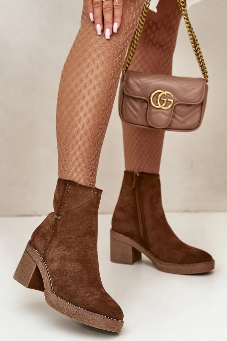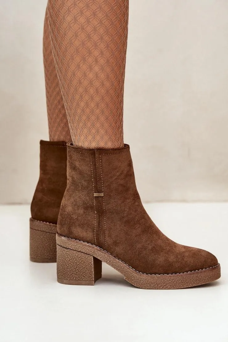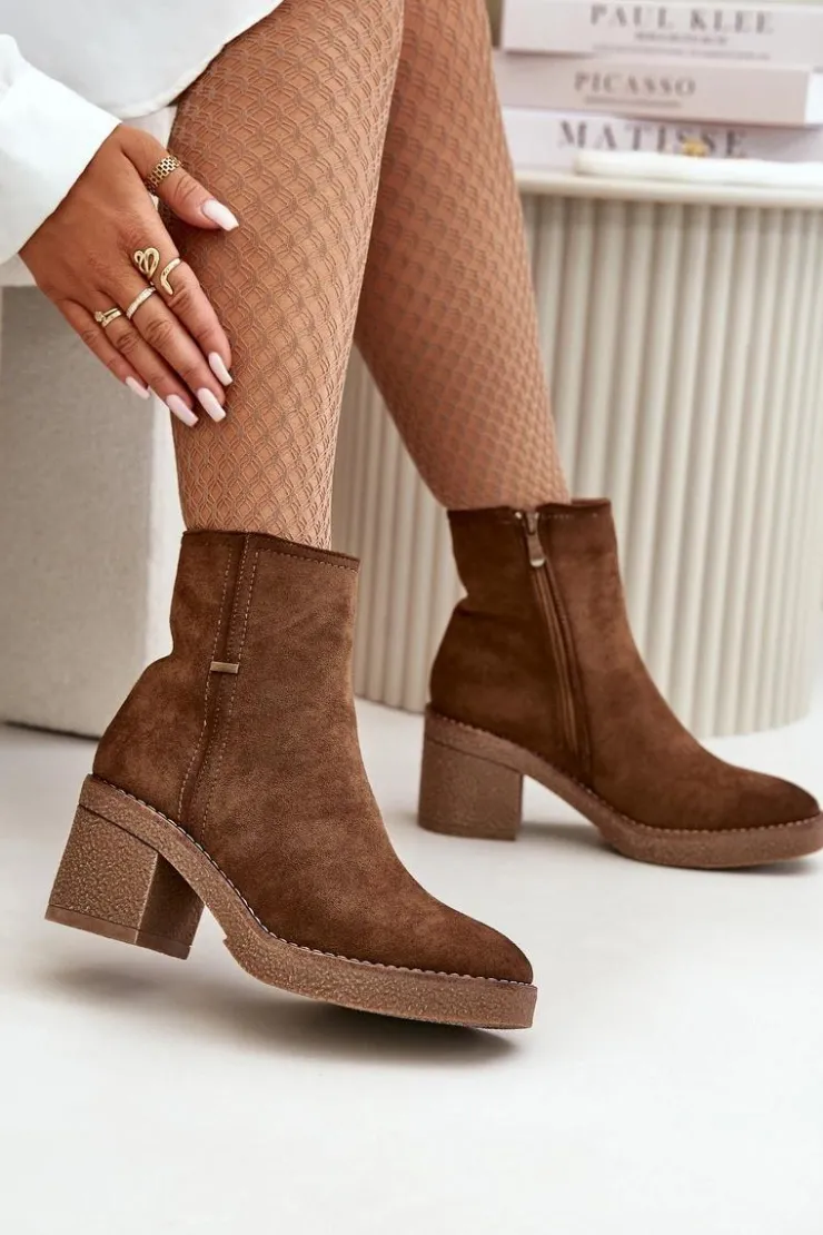 Damskie botki z eko zamszu, który jest miękki i przyjemny w dotyku. Osadzone na stabilnym obcasie w formie słupka, co zapewnia wygodę i pewność chodzenia przez cały dzień, jednocześnie dodając kilka centymetrów wzrostu i podkreślając sylwetkę. Wnętrze ocieplone jest kocem obuwniczym, który zapewnia ciepło i komfort w chłodniejsze dni, chroniąc stopy przed zimnem. Dzięki zapięciu na zamek, ich zakładanie i zdejmowanie jest szybkie i bezproblemowe, co jest dużym atutem w codziennym użytkowaniu. Przy wyborze rozmiaru prosimy sugerować się tabelą rozmiarów.