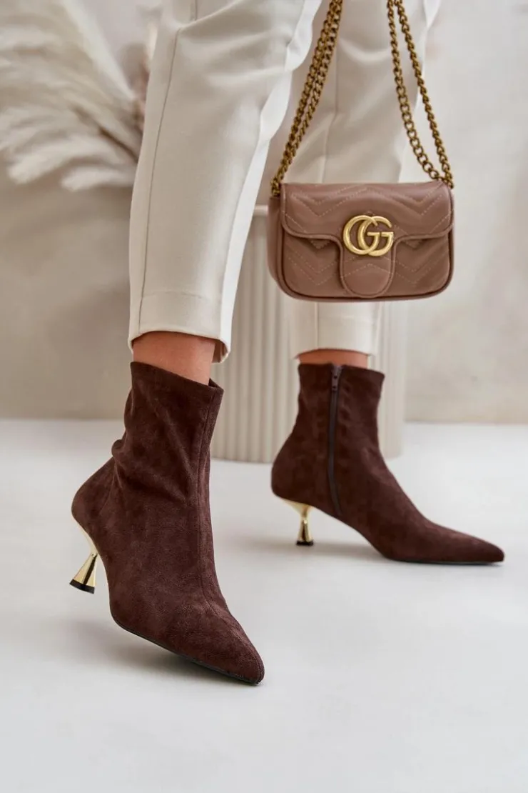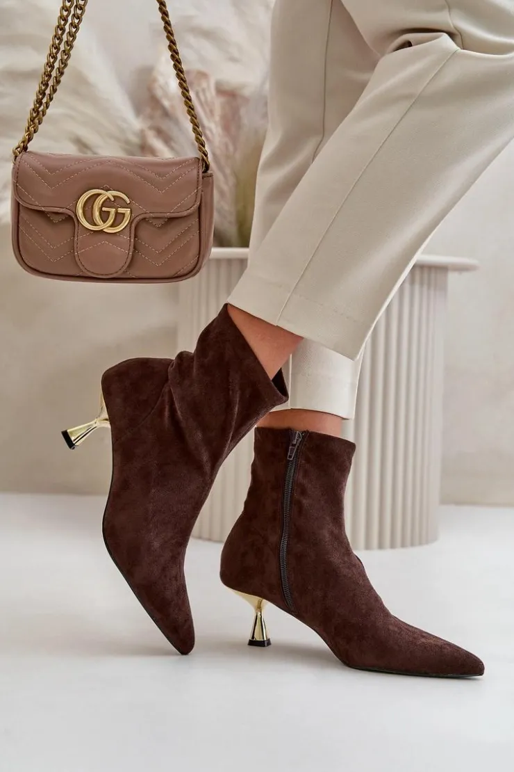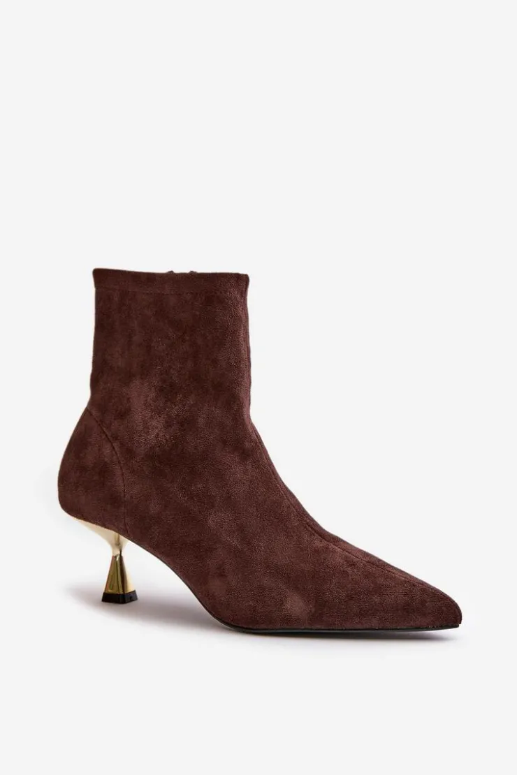 Stylowe botki damskie na ozdobnej szpilce to elegancki dodatek, który z pewnością przyciągnie spojrzenia. Wykonane z eko zamszu. Zapinane na zamek, który zapewnia wygodę i łatwość zakładania. Noski w szpic dodają wyrafinowanego charakteru, podkreślając kobiecość i smukłość sylwetki. Idealne na specjalne okazje, jak i do codziennych stylizacji, kiedy chcesz dodać sobie odrobinę elegancji. Przy wyborze rozmiaru prosimy sugerować się tabelą rozmiarów.