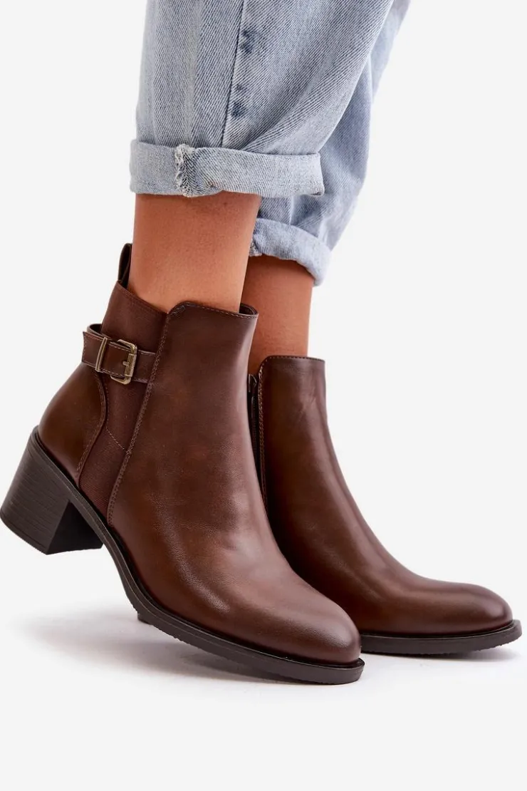 Botki damskie wykonane z eko skóry. Wnętrze ocieplone jest kocem obuwniczym, co zapewnia dodatkowe ciepło i komfort podczas chłodniejszych dni. Model zapinany na zamek, co ułatwia zakładanie i zdejmowanie, a także zapewnia doskonałe dopasowanie do stopy. Ozdobione detalem w postaci paseczka z klamrą. Idealne na jesienne i zimowe dni! Przy wyborze rozmiaru prosimy sugerować się tabelą rozmiarów.