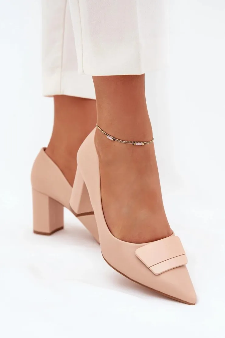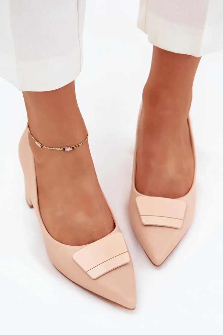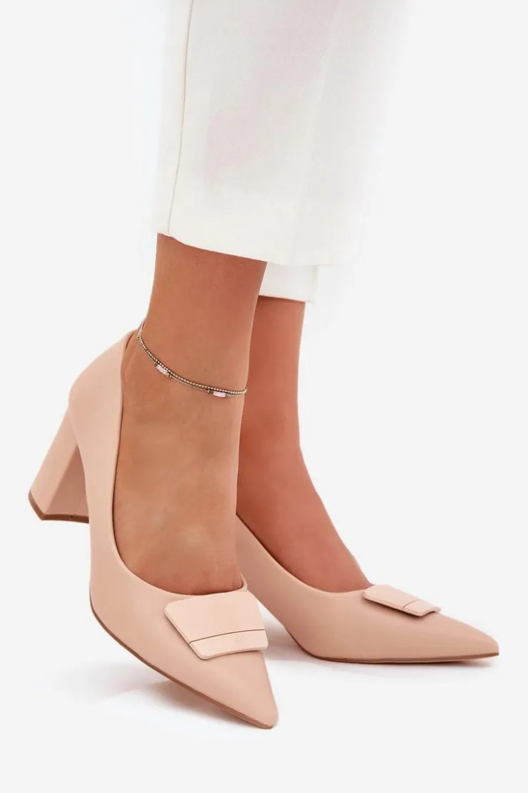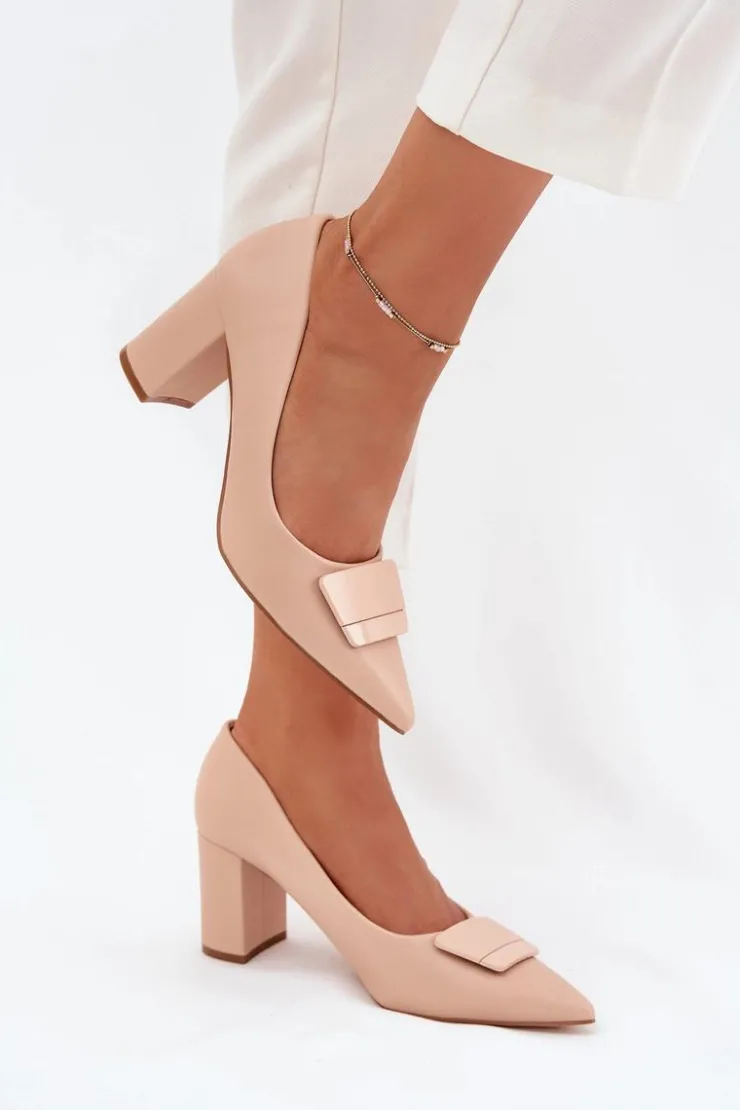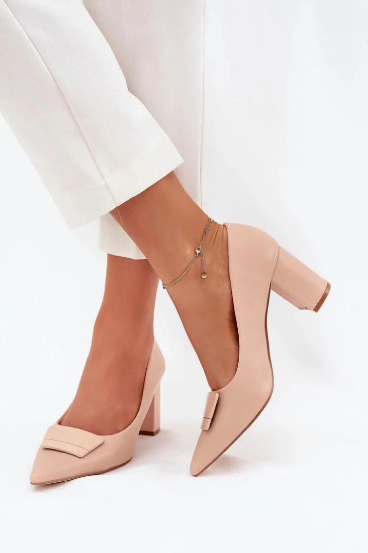 Czółenka damskie z eko skóry, osadzone na obcasie w formie słupka, łączą elegancję z wygodą. Szpiczaste noski wysmuklają nogi, a ozdobny detal z przodu dodaje im subtelnego uroku. Elegancki fason sprawia, że pasują do formalnych stylizacji, doskonale komponując się z sukienkami, spódnicami czy eleganckimi spodniami. Przy wyborze rozmiaru prosimy kierować się tabelą rozmiarów