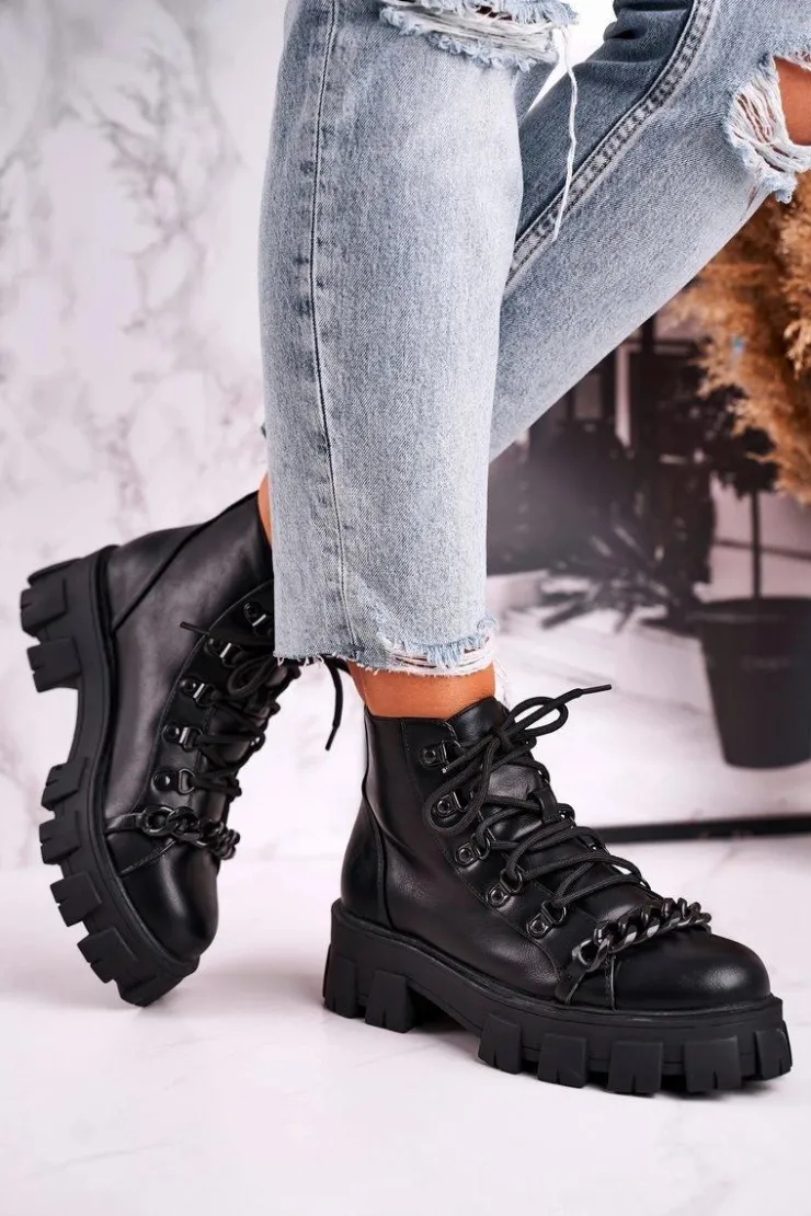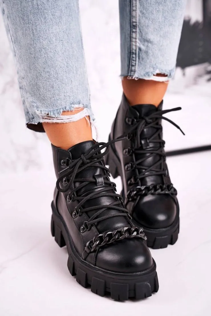 New Boto Damskie Botki Workery Na Platformie Czarne Chain