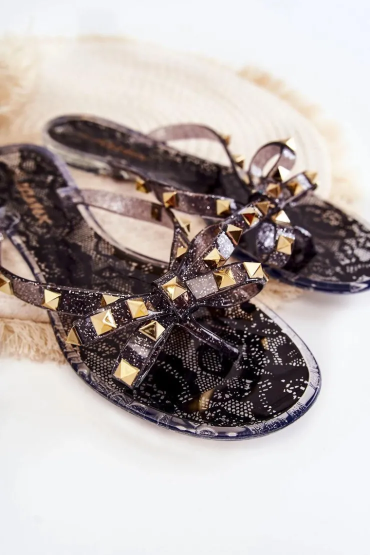 Wyjątkowe klapki o fasonie japonek zostały wykonane z gumowego tworzywa. Posiadają ozdobne elementy na paskach w postaci ćwieków. Na przodzie znajduje się urocza kokardka. Wkładka została wykonana z tworzywa sztucznego. Buty osadzone na płaskim obcasie. Ten model świetnie sprawdzi się podczas upalnych dni! Koniecznie musisz je mieć!