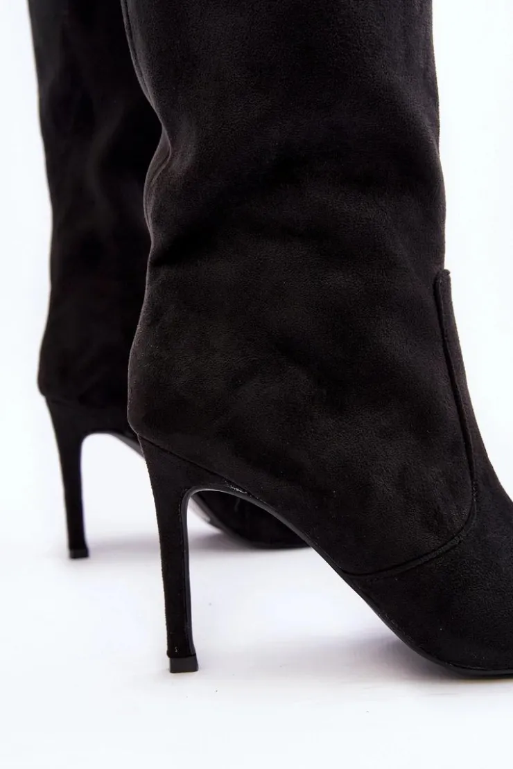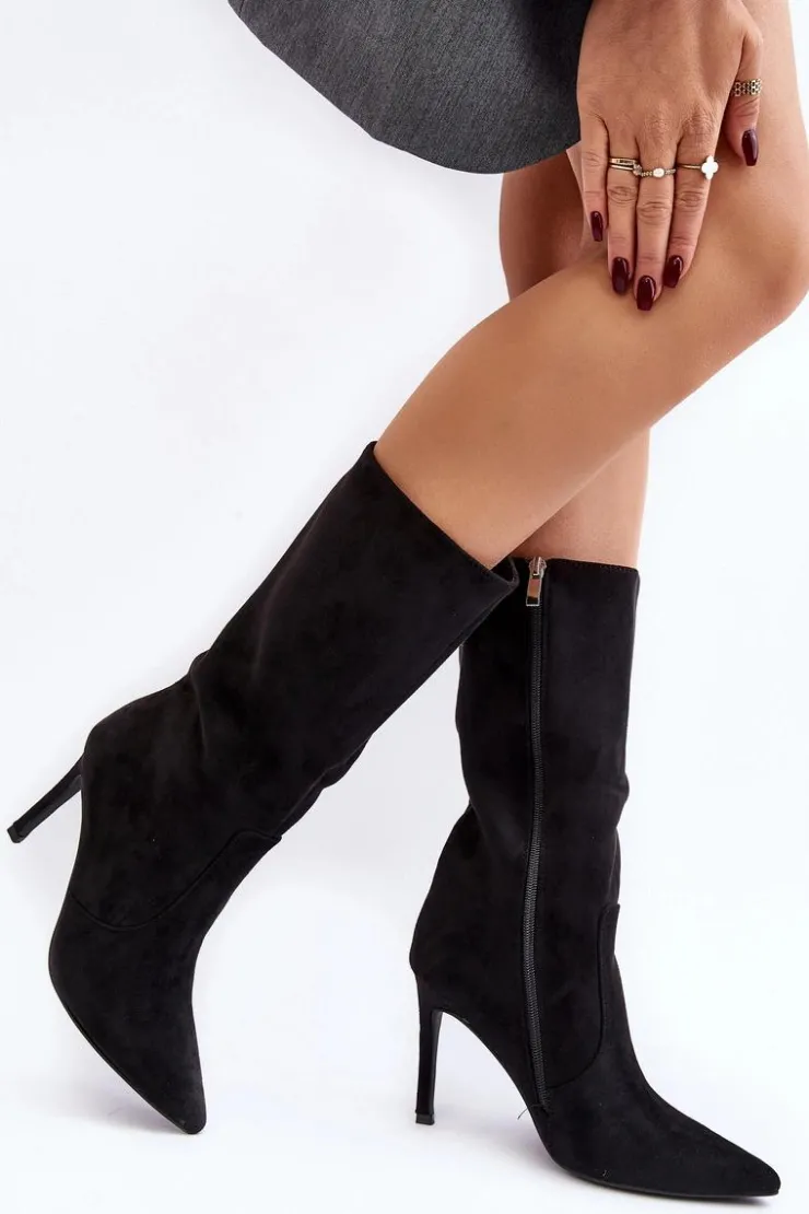 Kozaki damskie wykonane z eko zamszu. Osadzone na zgrabnej szpilce, co dodaje im kobiecego uroku, a jednocześnie gwarantuje elegancję. Ocieplenie w postaci koca obuwniczego zapewnia ciepło i komfort w chłodniejsze dni. Delikatnie szpiczaste noski optycznie wysmuklają nogi, dodając subtelnego wdzięku. Suwak na całej długości cholewki ułatwia zarówno zakładanie, jak i zdejmowanie butów. Ten wyjątkowy model zasługuje na swoje miejsce w Twojej garderobie! Przy wyborze rozmiaru prosimy sugerować się tabelą rozmiarów.