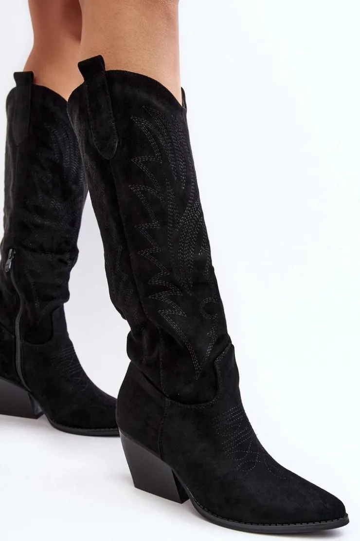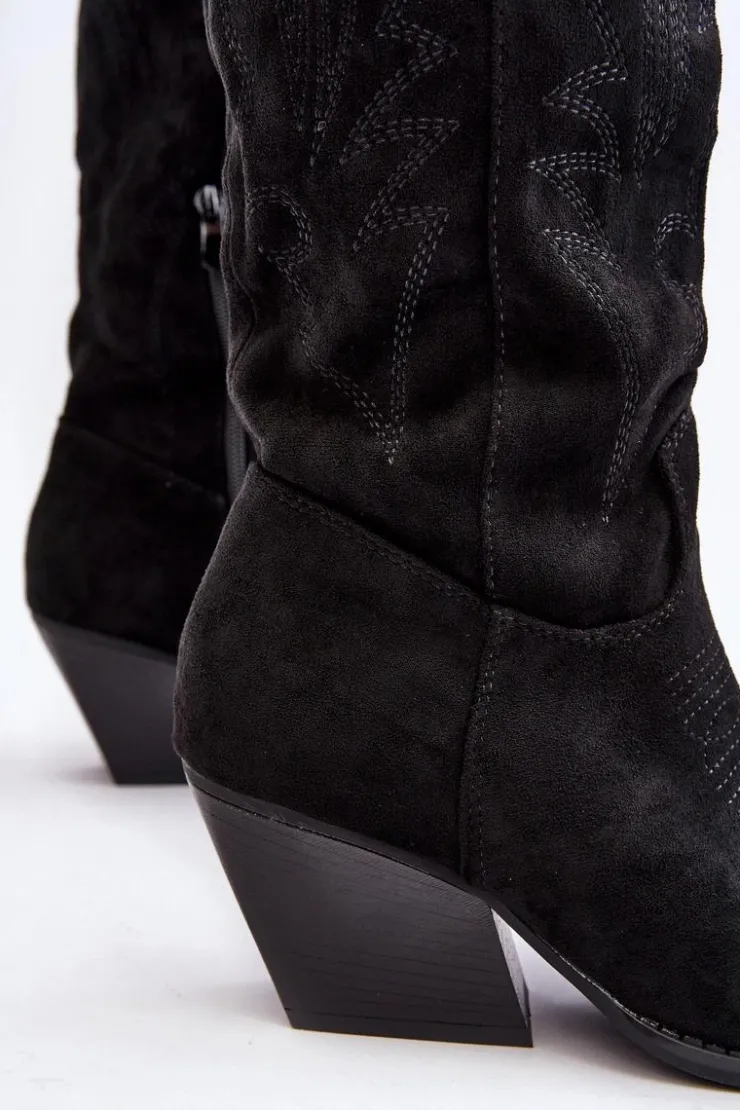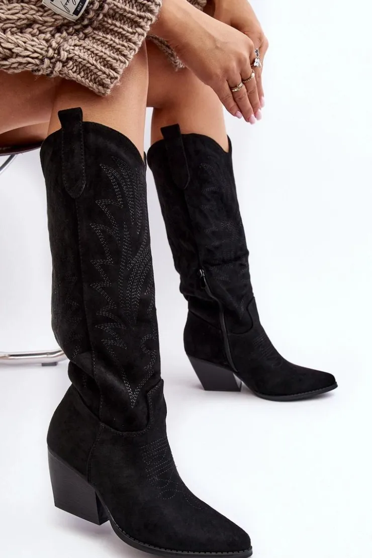 Damskie kozaki przed kolano wykonane z eko zamszu. Osadzone na obcasie w postaci niskiego słupka. Noski w szpic optycznie wysmuklą nogi. Zapiętek jest usztywniony. Miękka wkładka zapewni komfort podczas użytkowania. Cholewka ozdobiona licznymi przeszyciami. Model wsuwany z dodatkowym suwakiem. Świetnie sprawdzą się podczas jesiennych stylizacji! Przy wyborze rozmiaru prosimy sugerować się tabelą rozmiarów.