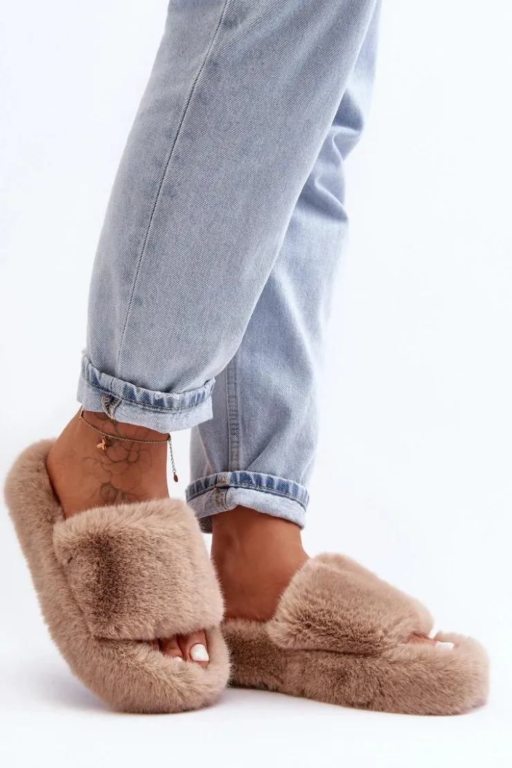 Kapcie damskie zostały wykonane z ekologicznego futerka. Model wsuwany z odkrytym noskiem i szerokim paskiem. Podeszwa wykonana z gumowego tworzywa ochroni przed zimnym podłożem. Przy wyborze rozmiaru prosimy kierować tabelą rozmiarów.