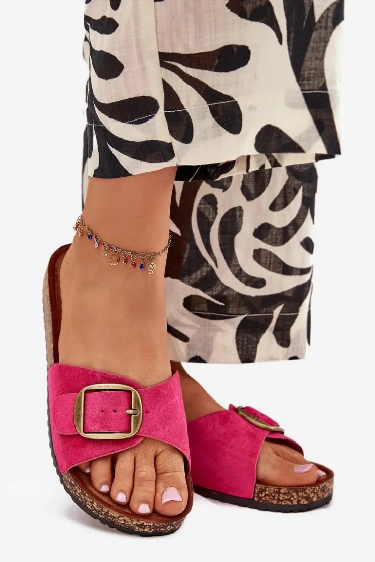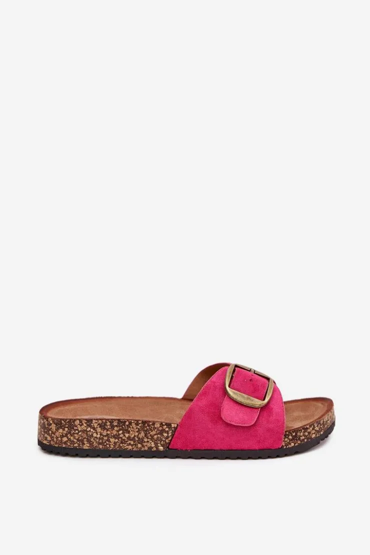 Klapki damskie wykonane z eko zamszu. Osadzone na korkowej platformie. Wyróżniają się klamrą z regulowanym paskiem, który umożliwia idealne dopasowanie do stopy. Profilowana wkładka zapewnia komfort przez cały dzień, a ich prosty wygląd sprawia, że są doskonałe do codziennych stylizacji. Idealne na letnie dni, pasują do sukienek, spódnic czy spodni, wprowadzając lekkość i styl do każdej kreacji. Przy wyborze rozmiaru rosimy sugerować się tabelą rozmiarów.