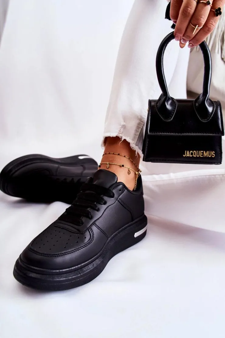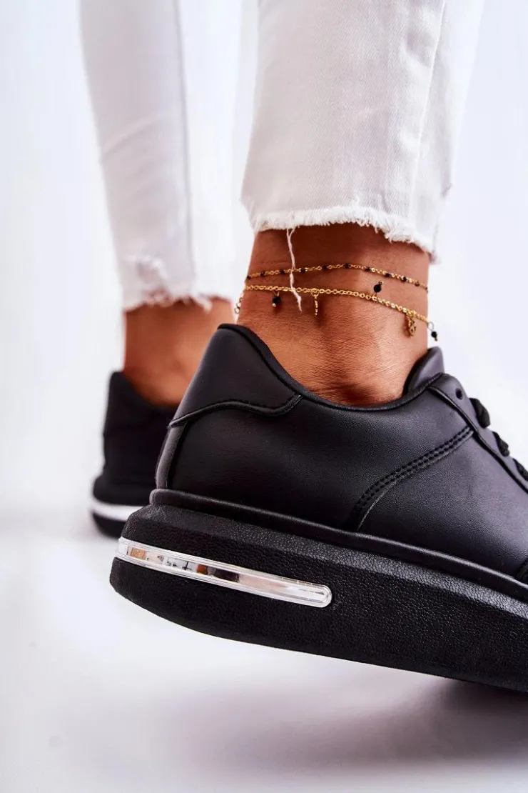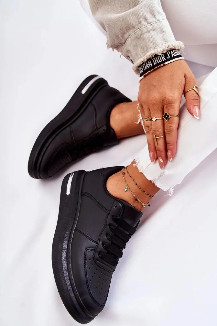 Klasyczne buty sportowe zostały wykonane z eko skóry. Osadzone na masywnej platformie z lustrzanym elementem. Model wiązany na płaskie sznurowadła. Miękka wkładka wykonana z pianki została pokryta tkaniną. Model z perforacją na przodzie, co pozwala na odpowiednią cyrkulację powietrza. Nosek zaokrąglony. Koniecznie powinnaś je mieć w swojej szafie! Przy wyborze rozmiaru prosimy kierować tabelą rozmiarów.