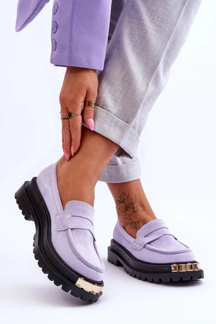 Klasyczne mokasyny zostały wykonane z ekologicznego zamszu. Na przodzie platformy posiadają ozdobne elementy. Osadzone na płaskim obcasie. Podeszwa z tworzywa sztucznego ze żłobieniami świetnie odizoluje od nierównego podłoża. Model wsuwany z usztywnianym zapiętkiem. Koniecznie powinnaś je mieć! Przy wyborze rozmiaru prosimy sugerować się tabelą rozmiarów.