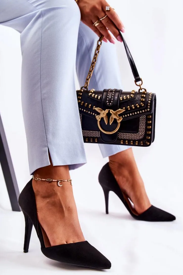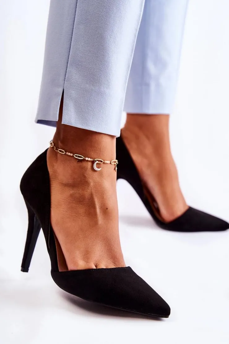 Klasyczne szpilki zostały wykonane z eko zamszu. Posiadają subtelne wycięcia po bokach cholewki. Zapiętek jest dodatkowo usztywniany z gumką. Buty zostały osadzone na obcasie w postaci szpilki. Nosek w szpic. Wygodna wkładka została wykonana z eko skóry. Model idealny na różnego rodzaju uroczystości. Koniecznie powinnaś je mieć w swojej garderobie! Przy wyborze rozmiaru prosimy sugerować się tabelą rozmiarów.