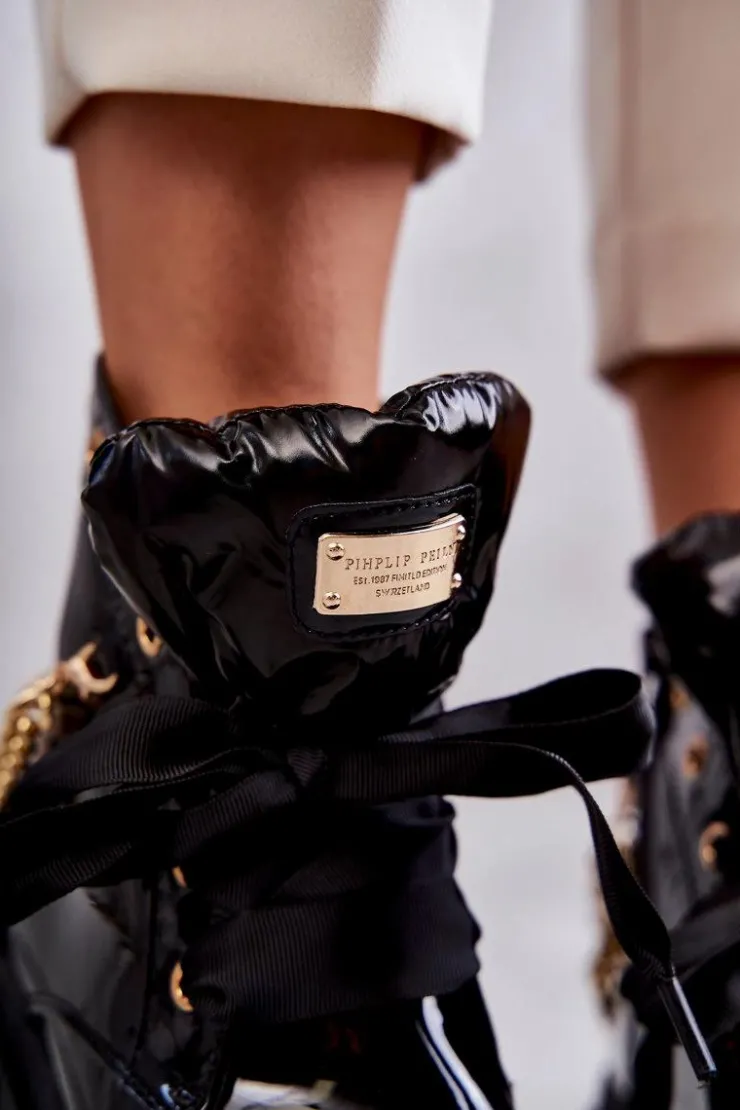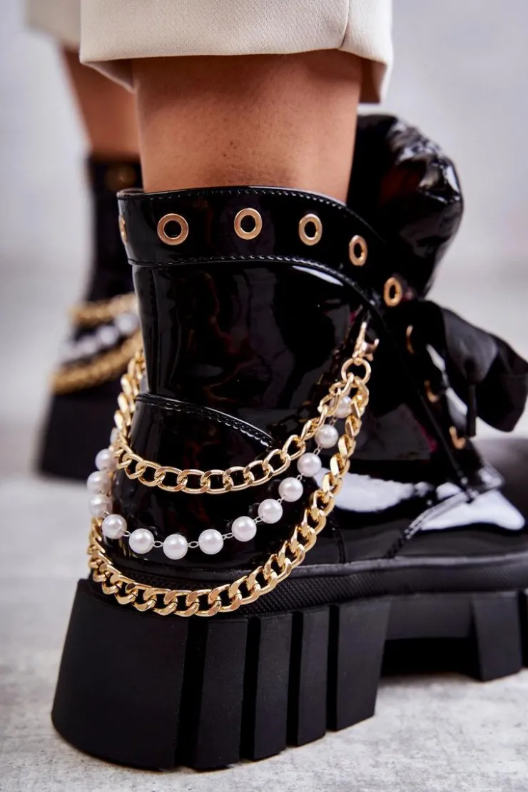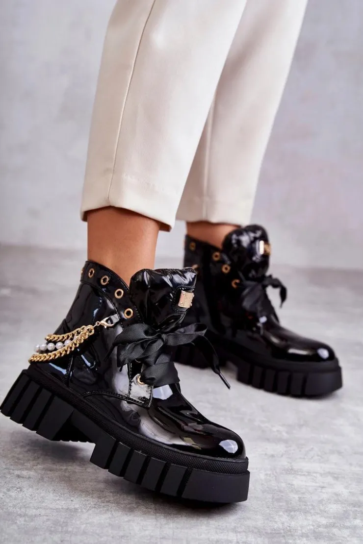 New Boto Lakierowane Ocieplane Botki Z Łańcuszkiem Czarne Karoline
