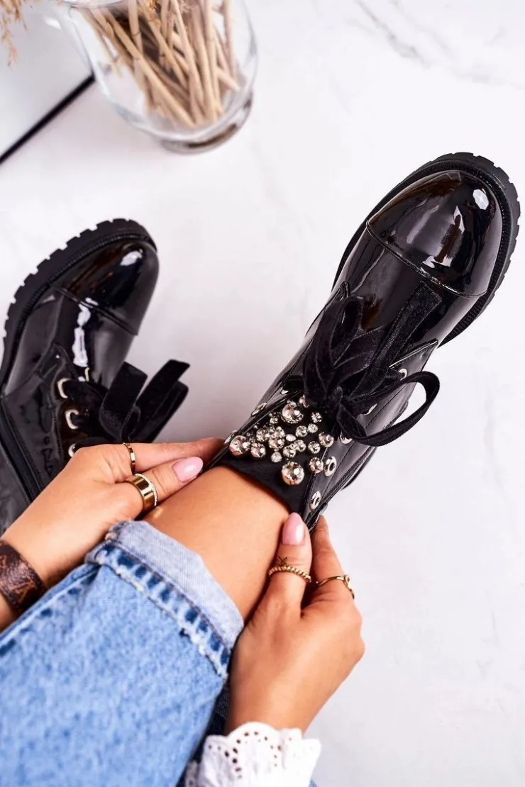 Wyjątkowe botki damskie wykonane z eko skóry. Wnętrze ocieplone jest miłym w dotyku kocem obuwniczym. Model wyróżnia się krojem cholewki oraz ozdobami. Przy wyborze rozmiaru prosimy sugerować się tabelą rozmiarów.