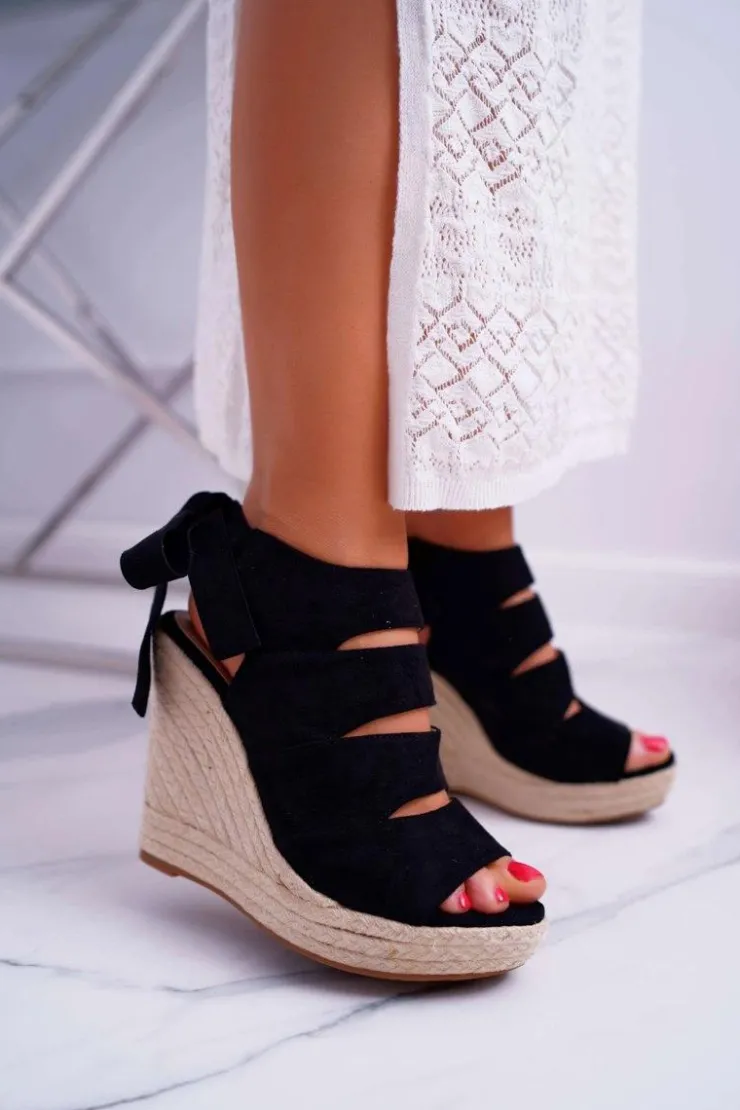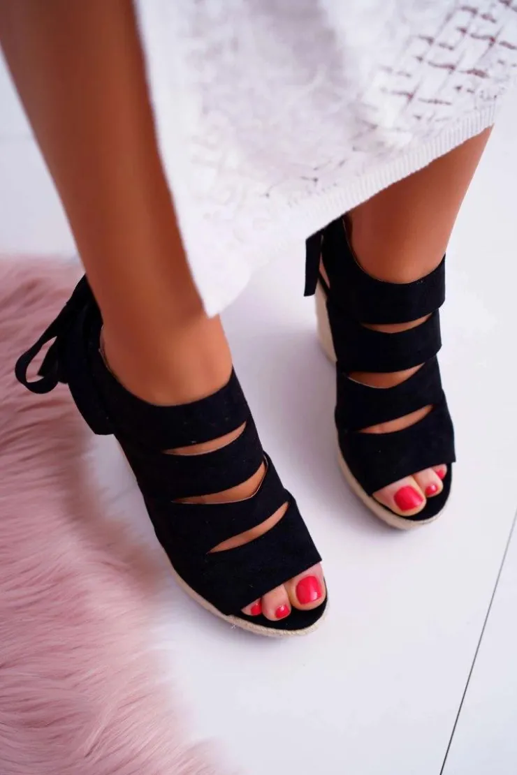 New Boto Sandały Damskie Na Koturnie Lniane Wiązane Czarne Cantare