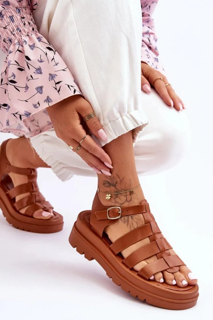 Przewiewne sandały damskie zostały wykonane z eko skóry. Zapinane na regulowany pasek ze sprzączką. Sandałki posiadają odkryty, lekko kwadratowy nosek oraz odkrytą piętę. Miękka, eko skórzana wkładka zapewni wygodę podczas użytkowania. Płaski obcas oraz platforma sprawiają, że buty są niezwykle stabilne. Te sandałki to idealny fason na upalne dni. Świetnie będą prezentować się z zarówno ze spodniami, jak i sukienkami. Przy wyborze rozmiaru prosimy sugerować się tabelą rozmiarów.