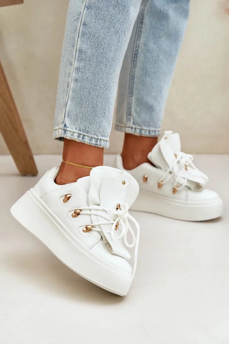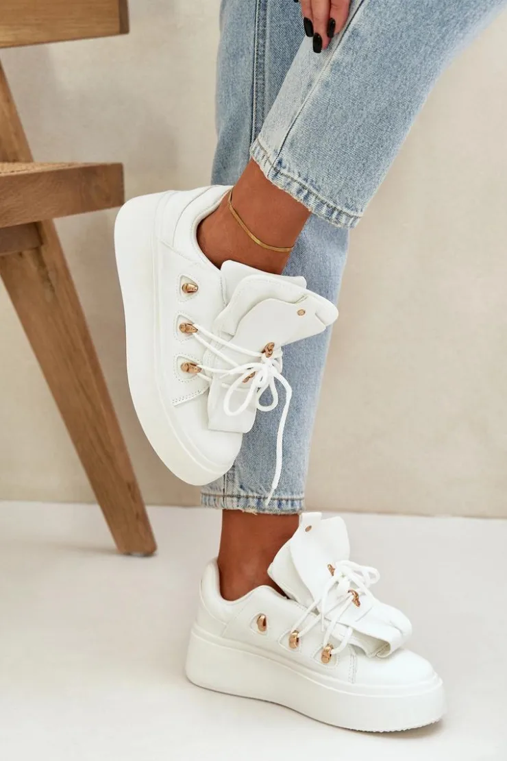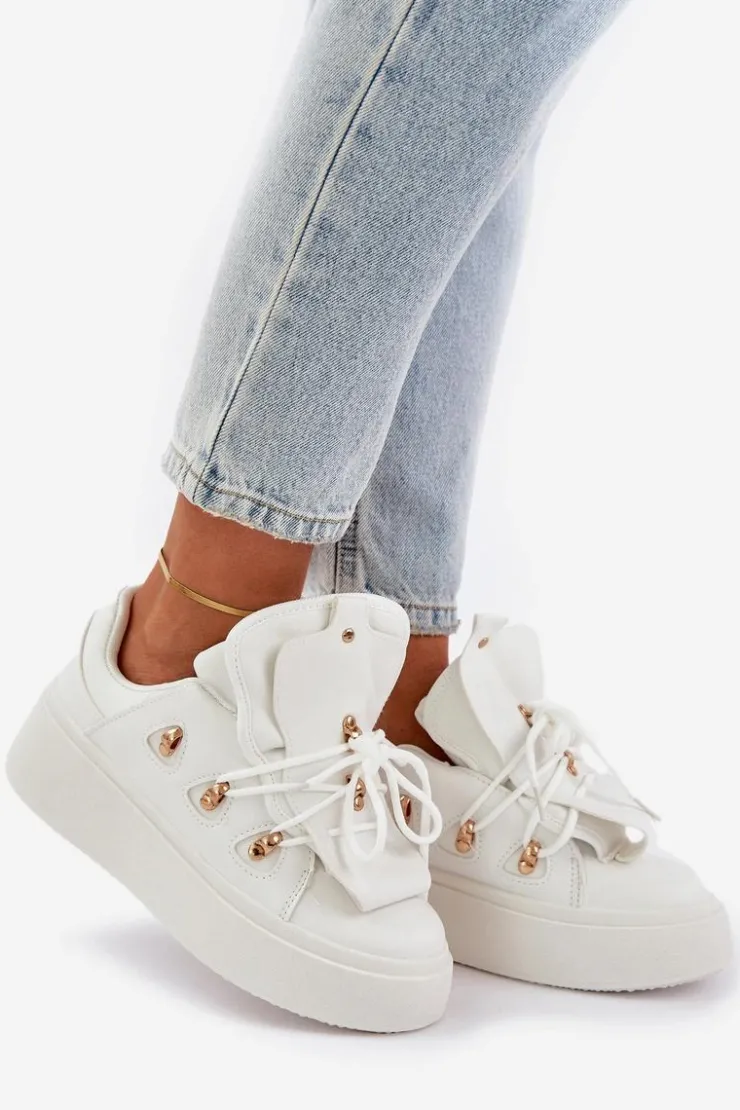 Damskie sneakersy wykonane z wysokiej jakości eko skóry to idealny wybór dla miłośniczek modnych rozwiązań. Osadzone na masywnej platformie, dodają kilku centymetrów wzrostu, jednocześnie zapewniając stabilność i komfort noszenia. Wkładka z miękkiej pianki zapewni wygodę nawet podczas długiego użytkowania. Ten stylowy fason idealnie dopełni wiele casualowych stylizacji! Przy wyborze rozmiaru prosimy kierować się tabelą rozmiarów.