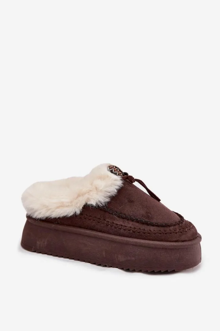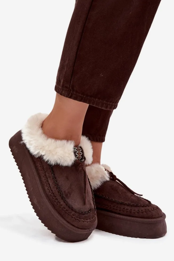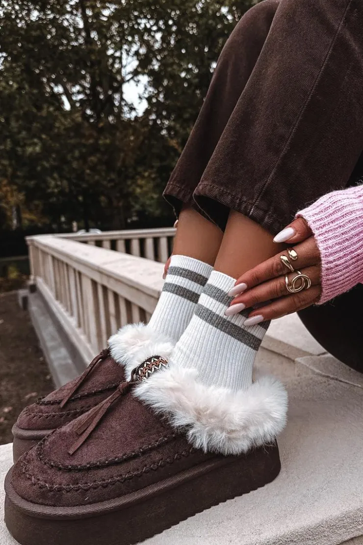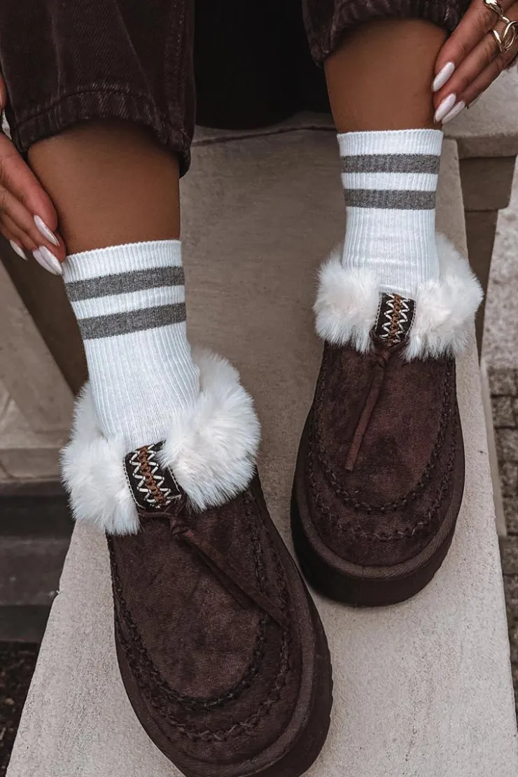 Śniegowce damskie wykonane z eko zamszu to idealne połączenie stylu i wygody na zimowe dni. Osadzone na platformie, która delikatnie wysmukla sylwetkę i doskonale izoluje od chłodnego podłoża, gwarantują komfort podczas noszenia. Górna część cholewki ozdobiona została miękkim futerkiem i dekoracyjnym paseczkiem, co nadaje całości modnego, zimowego charakteru. Wnętrze butów również ocieplone jest futerkiem, zapewniając ciepło i przyjemne otulenie stóp nawet w mroźne dni. To stylowe śniegowce, które świetnie sprawdzą się w codziennych zimowych stylizacjach.