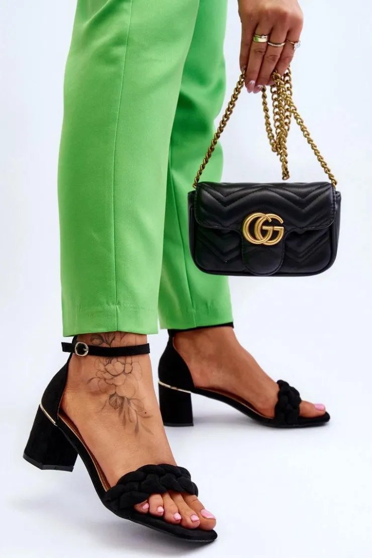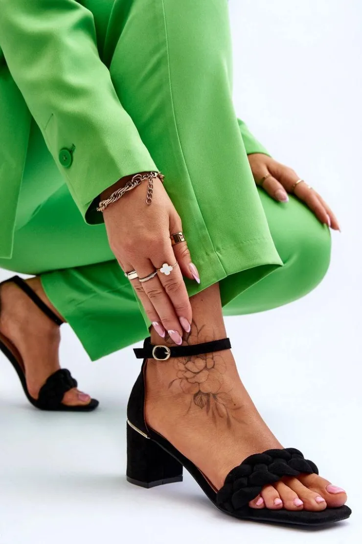 Eleganckie sandały damskie zostały osadzone na obcasie w postaci słupka. Wykonane z miłego w dotyku eko zamszu. Posiadają ozdobny pasek w formie warkocza na przodzie obuwia. Zapinane wokół kostki na sprzączkę z regulowanym paskiem. Miękka wkładka z eko skóry oraz wygodny obcas zapewnią komfort podczas użytkowania. Świetnie sprawdzą się na spotkania biznesowe, uroczystości rodzinne czy romantyczny spacer. Przy wyborze rozmiaru prosimy sugerować się tabelą rozmiarów.