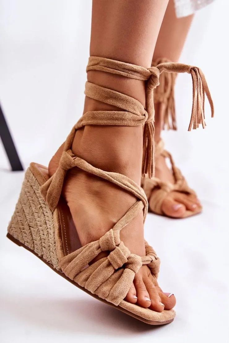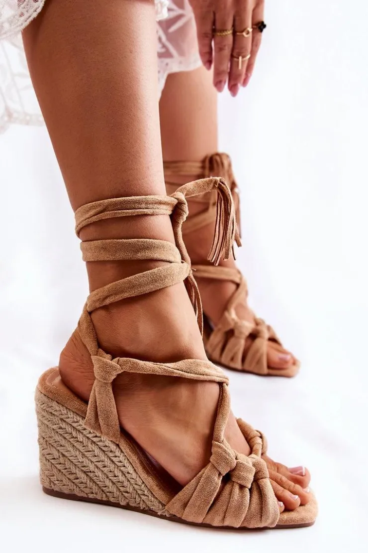New Boto Zamszowe Wiązane Sandały Na Koturnie Beżowe Flavia Beżowy