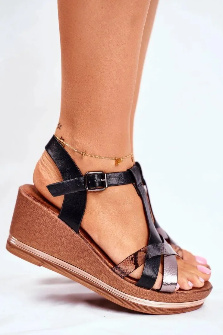 New Evento Sandały Damskie Na Koturnie Czarne Skóra Węża Enroll