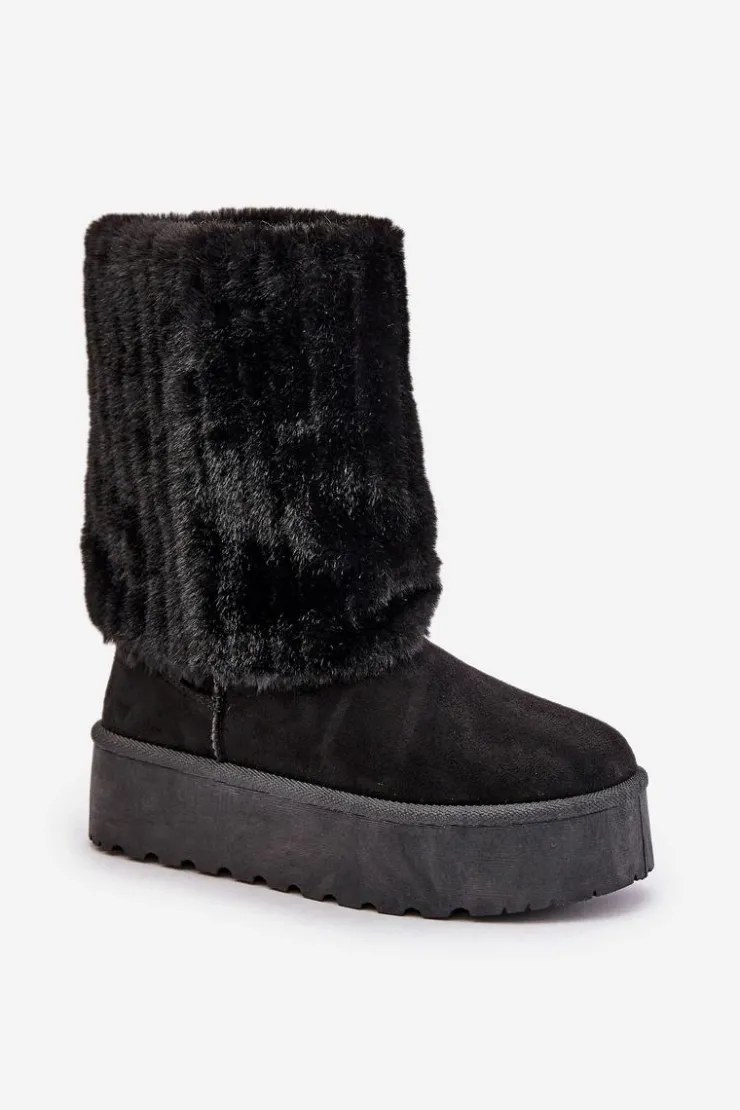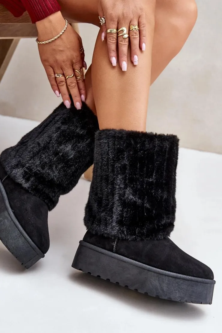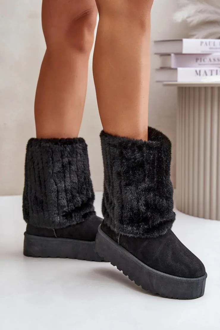 Wysokie śniegowce damskie z wywiniętą cholewką. Wykonane z ekologicznego zamszu. Osadzone na platformie. Wnętrze ocieplane futerkiem gwarantuje ciepło, co sprawia, że są doskonałym wyborem na zimowe dni, skutecznie chroniąc przed chłodem. Stylowy wygląd umożliwia ich łatwe dopasowanie do różnych stylizacji, dodając każdej zimowej stylizacji niepowtarzalny charakter. Przy wyborze rozmiaru prosimy sugerować się tabelą rozmiarów.