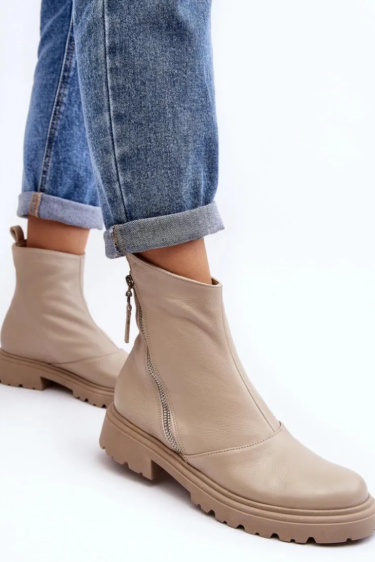 Damskie botki wykonane ze skóry naturalnej. Posiadają zamek z boku cholewki. Osadzone na płaskim obcasie ze żłobieniami. Środek ocieplony kocem obuwniczym. Noski zaokrąglone. Usztywniony zapiętek. Świetny model do wielu stylizacji! Musisz je mieć! Przy wyborze rozmiaru prosimy sugerować się tabelą rozmiarów.