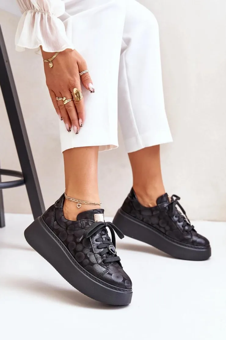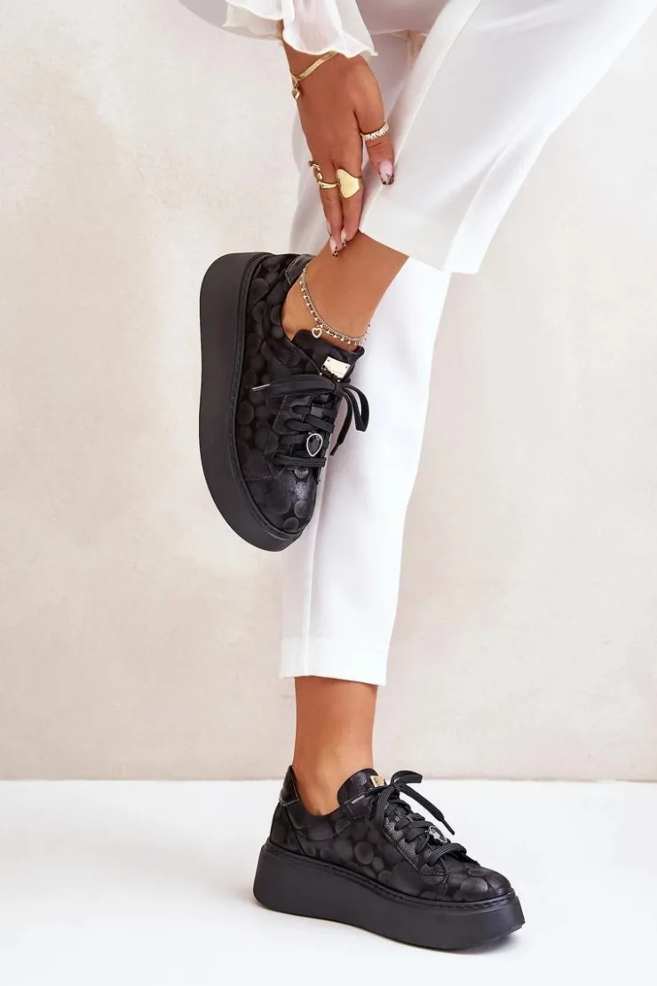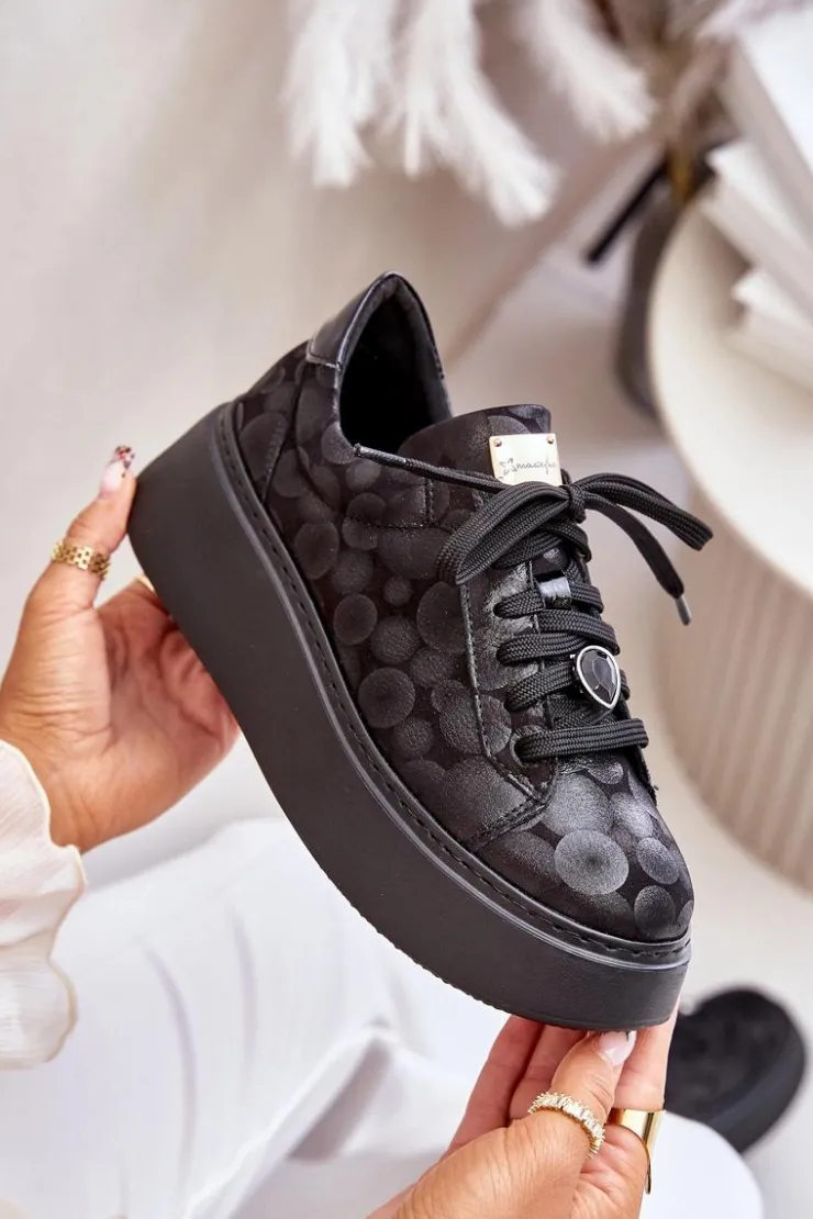 Buty sportowe marki Maciejka. Wykonane z naturalnej skóry z dbałością o szczegóły. Osadzone na masywnej platformie. Model klasycznie sznurowany z usztywnionym zapiętkiem. Noski zaokrąglone. Miękka, wkładka zapewni komfort podczas użytkowania. Na sznurówkach przypięta jest mała, biżuteryjna ozdoba. Przy wyborze rozmiaru prosimy sugerować się tabelą rozmiarów.