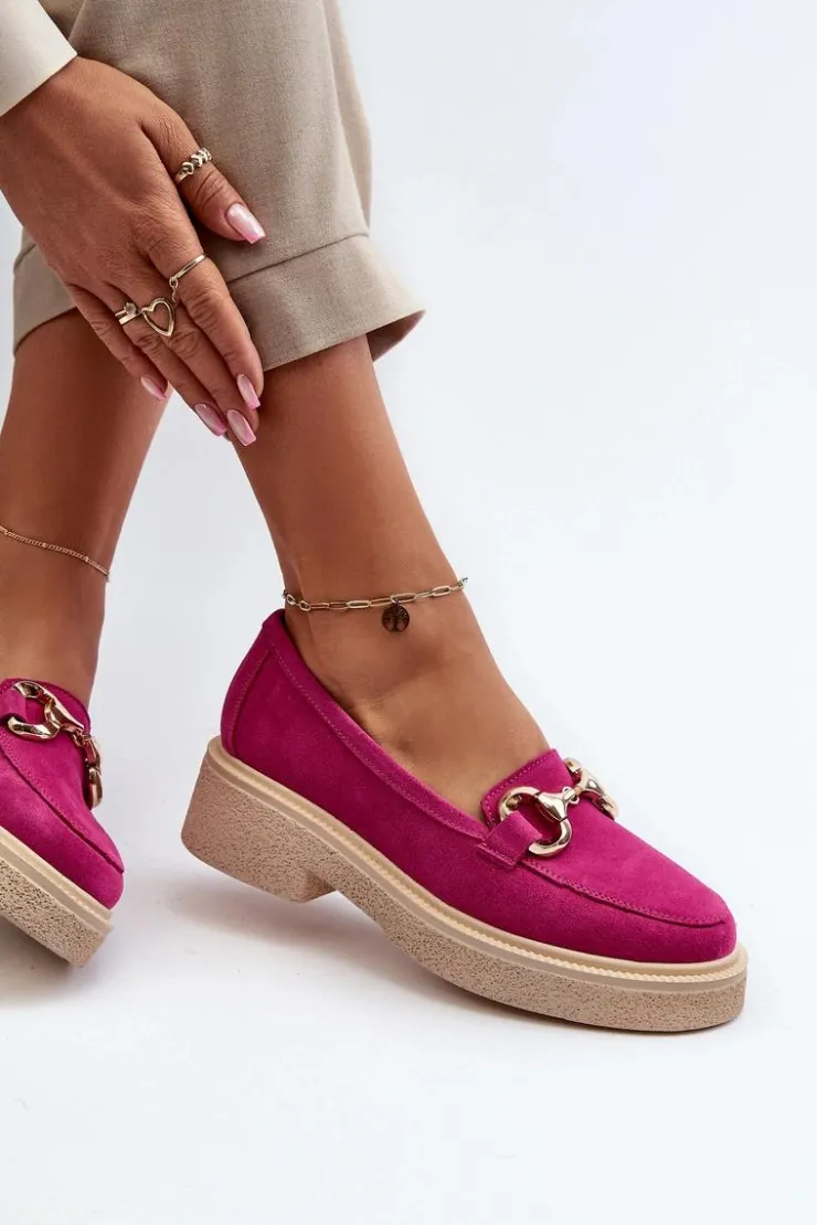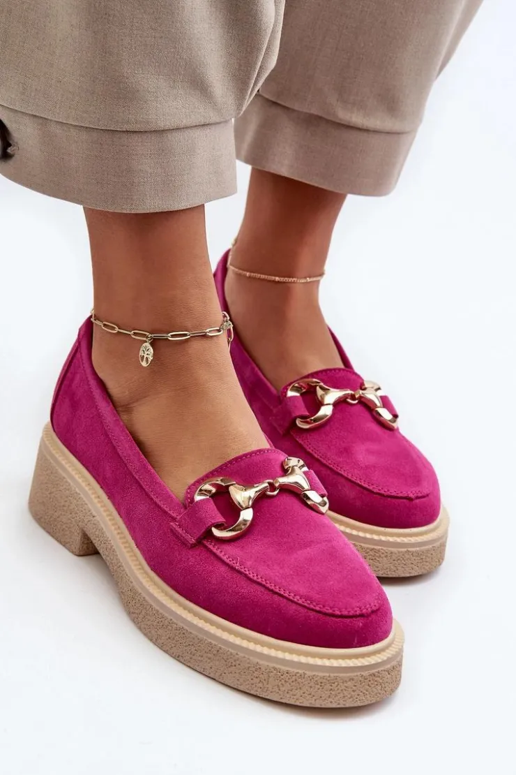 Te eleganckie mokasyny damskie wykonane z naturalnego zamszu są nie tylko wyjątkowo stylowe, ale także niezwykle wygodne. Ich przód ozdobiony jest złotą ozdobą, która dodaje im nutę luksusu i elegancji. Osadzone na platformie i płaskim obcasie. Profilowana wkładka zapewni wygodę podczas użytkowania. Niezwykle modny fason, który wykorzystasz do wielu stylizacji! Przy wyborze rozmiaru prosimy sugerować się tabelą rozmiarów.