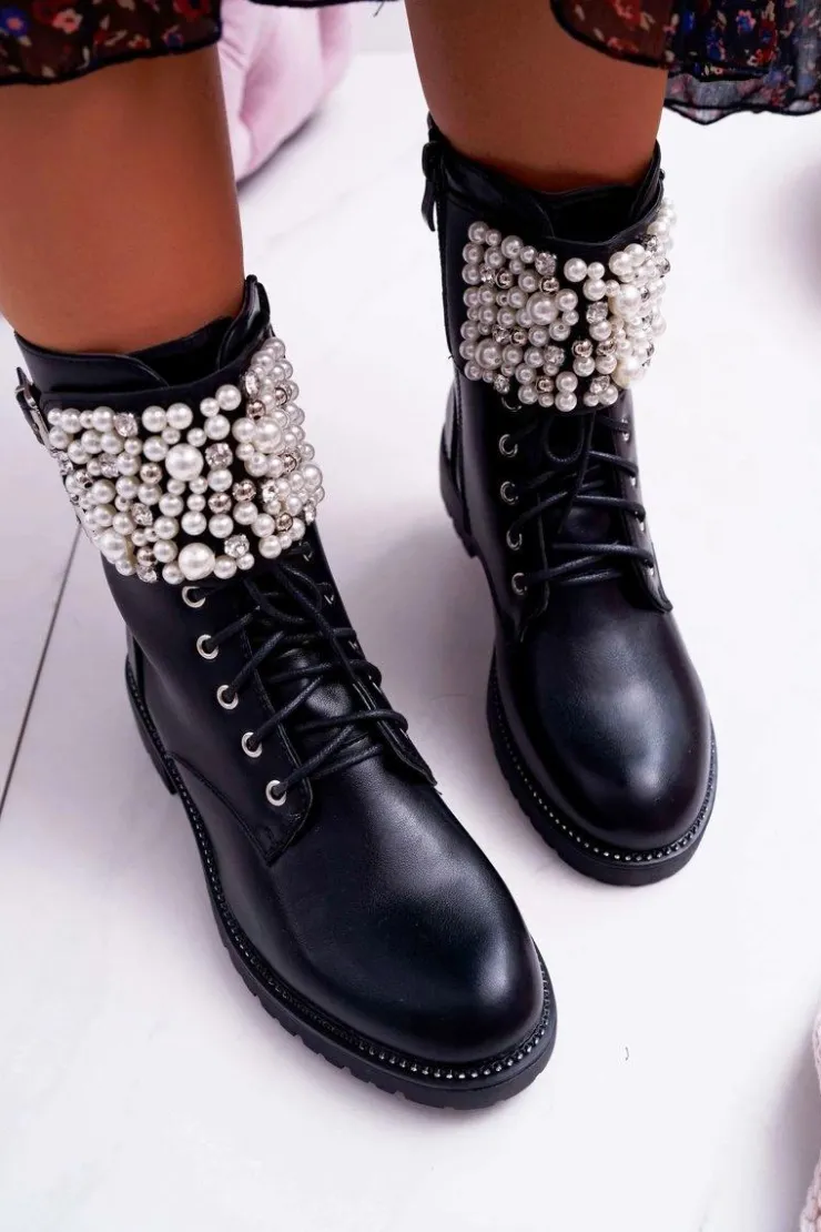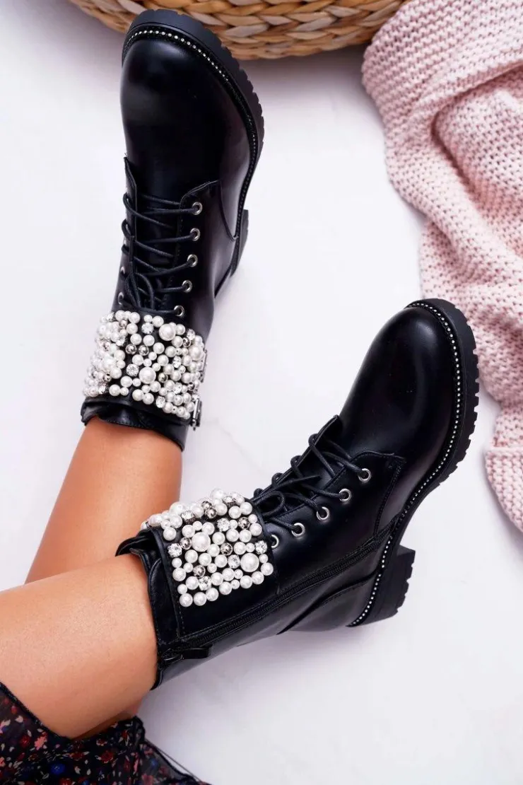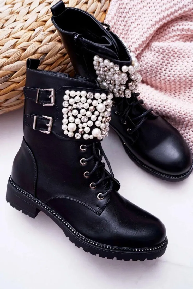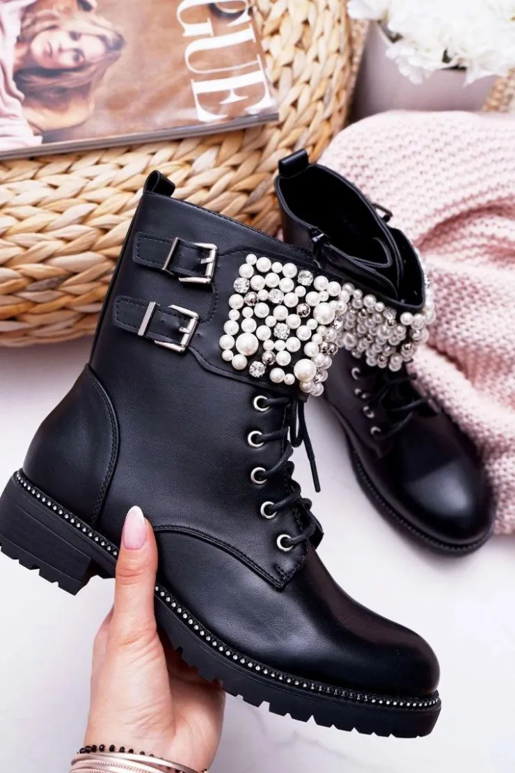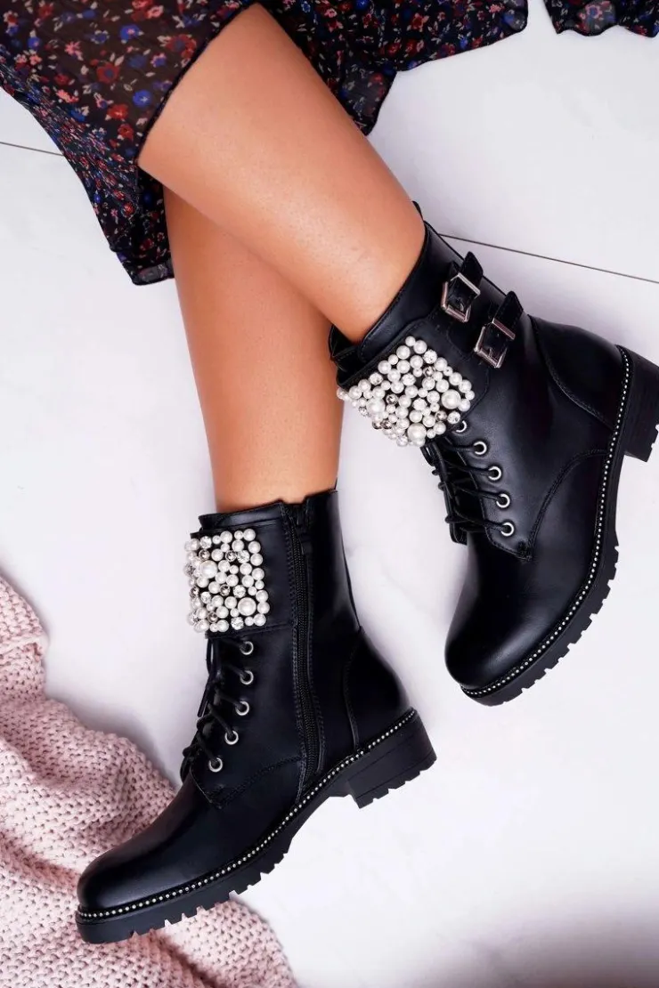Online Boto Botki Damskie Płaski Obcas Militarne Czarne Bemmer