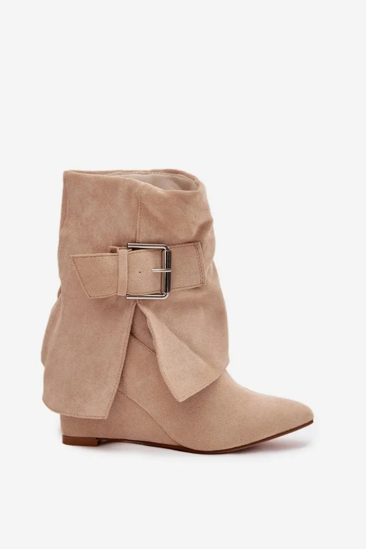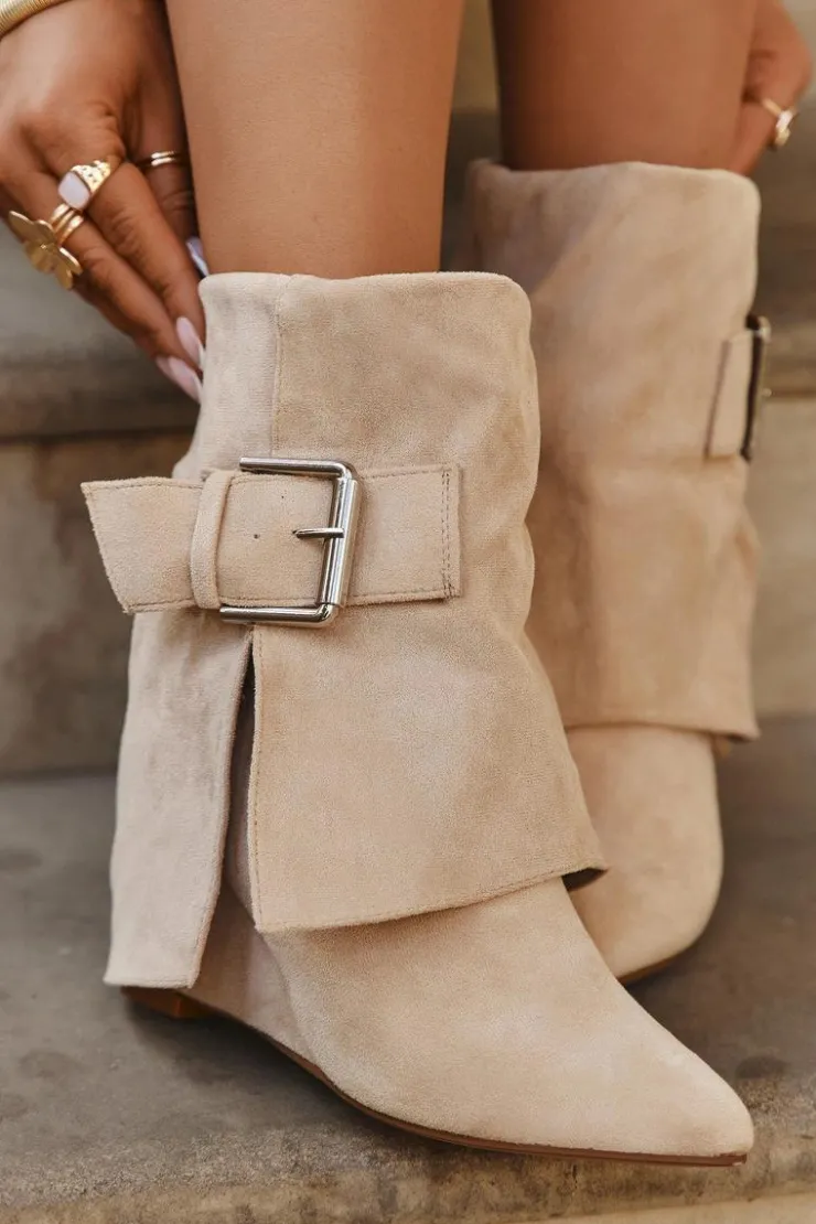 Botki z eko zamszu to oryginalny i stylowy wybór na co dzień i specjalne okazje. Model charakteryzuje się wywiniętą cholewką, która efektownie zachodzi na obcas koturn, nadając nowoczesny wygląd. Wsuwane botki z dodatkowym zapięciem na zamek zapewniają łatwość zakładania i idealne dopasowanie. Szpiczaste noski dodają elegancji, a duża klamra na cholewce stanowi wyrazisty akcent, który podkreśla unikatowy design. Te botki świetnie sprawdzą się w modnych, jesienno-zimowych stylizacjach, łącząc wygodę z wyrazistym stylem. Przy wyborze rozmiaru prosimy sugerować się tabelą rozmiarów.