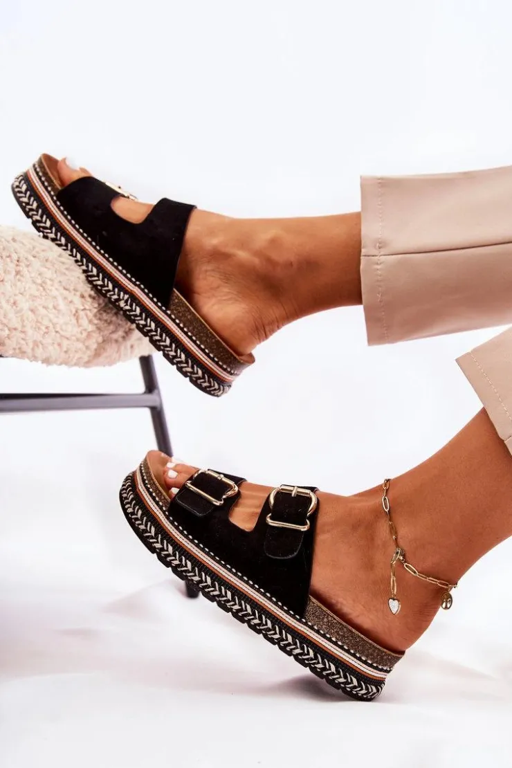 Idealne klapki na letnie spacery oraz codzienne wyjścia na zakupy. Klapki te posiadają dwa szerokie paski zapinane na sprzączkę, które można regulować. Wygoda oraz komfort użytkowania gwarantowane, dzięki profilowanej, wykonanej z eko zamszu wkładce. Platforma wykonana z lekkiego tworzywa sztucznego dodatkowo zdobiona plecionką. Klapki te sprawiają, że Twoje stopy będą wypoczęte i zrelaksowane. Przy wyborze rozmiaru prosimy sugerować się tabelą rozmiarów.