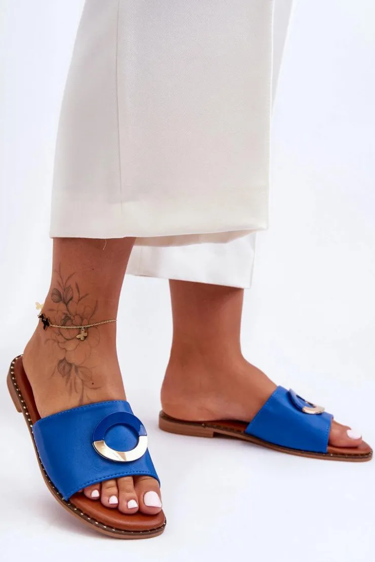 Damskie klapki zostały wykonane z eko skóry. Posiadają na przodzie ozdobę w postaci koła. Klapki osadzono na płaskim obcasie i antypoślizgowej, gumowej podeszwie. Wkładka jest niezwykle miękka i wygodna w użytkowaniu, co zwiększa komfort użytkowania. Nosek w tych klapkach jest odkryty i lekko zaokrąglony. Dodatkowo przy podeszwie znajdują się ozdobne ćwieki. Przy wyborze rozmiaru prosimy sugerować się tabelą rozmiarów.