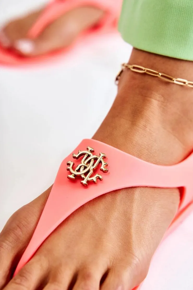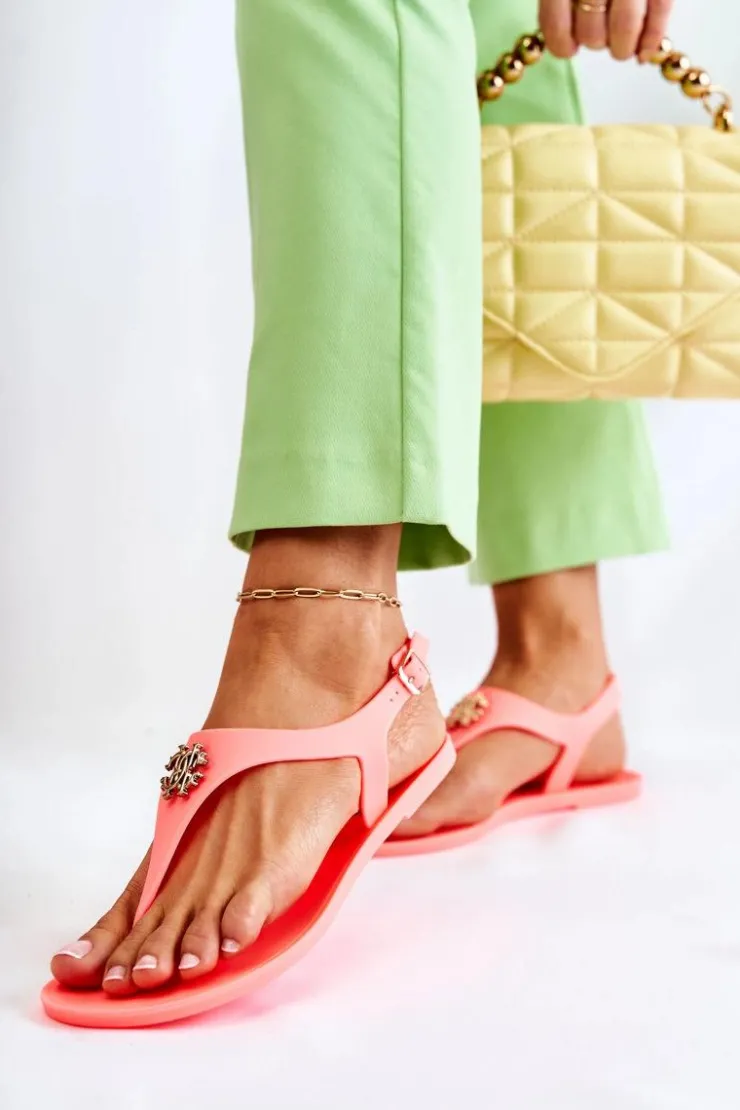 Gumowe sandałki są idealnym obuwiem na letnie dni! Niezwykle przewiewny model. Sandałki w formie japonek z odkrytym, zaokrąglonym noskiem. Zapinane wokół kostki na regulowany pasek ze sprzączką. Osadzone na niskim, płaskim obcasie. Na środkowym pasku znajduje się ozdobny emblemat. Model, który powinnaś mieć w swojej szafie! Przy wyborze rozmiaru, prosimy sugerować się tabelą rozmiarów.