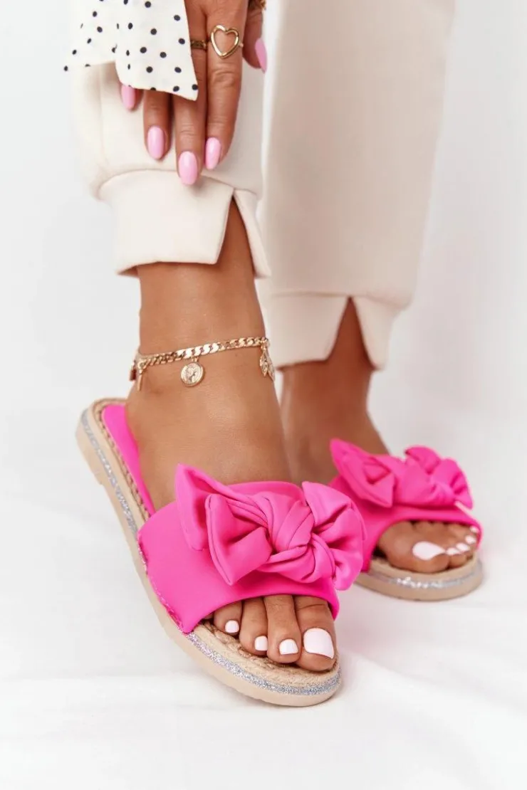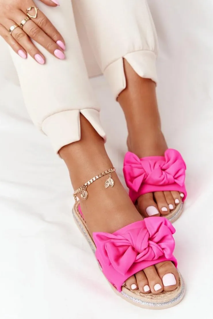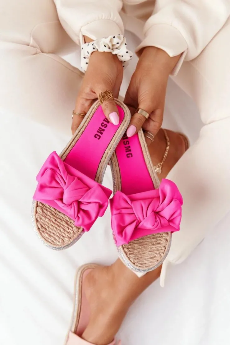 Gumowe klapki damskie z kokardą. Klapki to świetna propozycja dla kobiet ceniących sobie komfort w letnie dni! Buty posiadają miękką materiałową wkładkę oraz gumową podeszwę. Przy wyborze rozmiaru prosimy sugerować się tabelą rozmiarów.