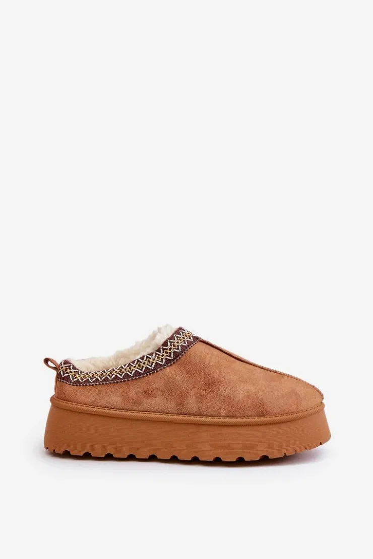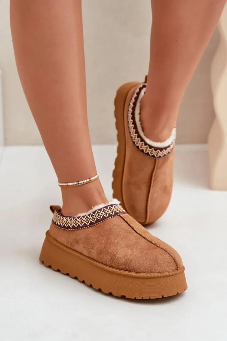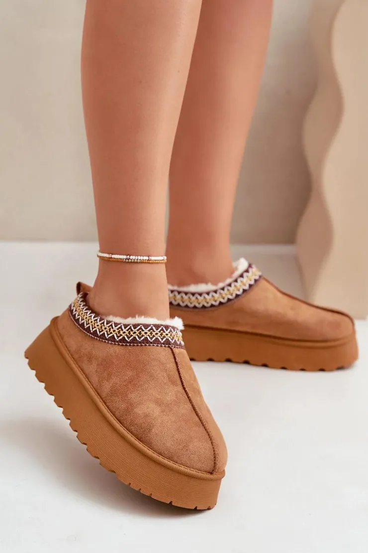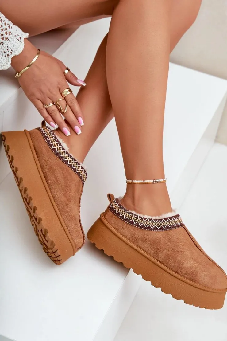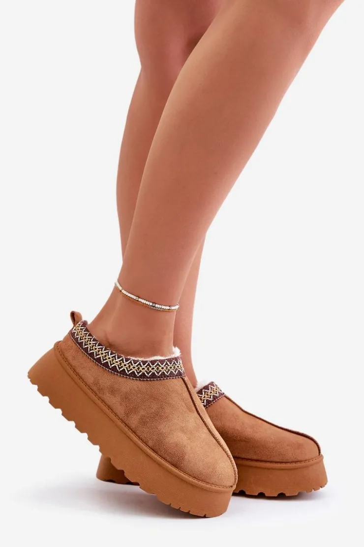 Stylowe kapcie wykonane z eko zamszu to doskonały wybór na chłodniejsze dni. Osadzone na platformie, z zakrytymi noskami i ocieplane miękkim futerkiem, zapewniają komfort i ciepło. Górę cholewki zdobi subtelny haft, który nadaje im eleganckiego charakteru. Idealne do codziennego użytku w domu oraz szybkie wyjścia na zewnątrz. Przy wyborze rozmiaru prosimy kierować tabelą rozmiarów.