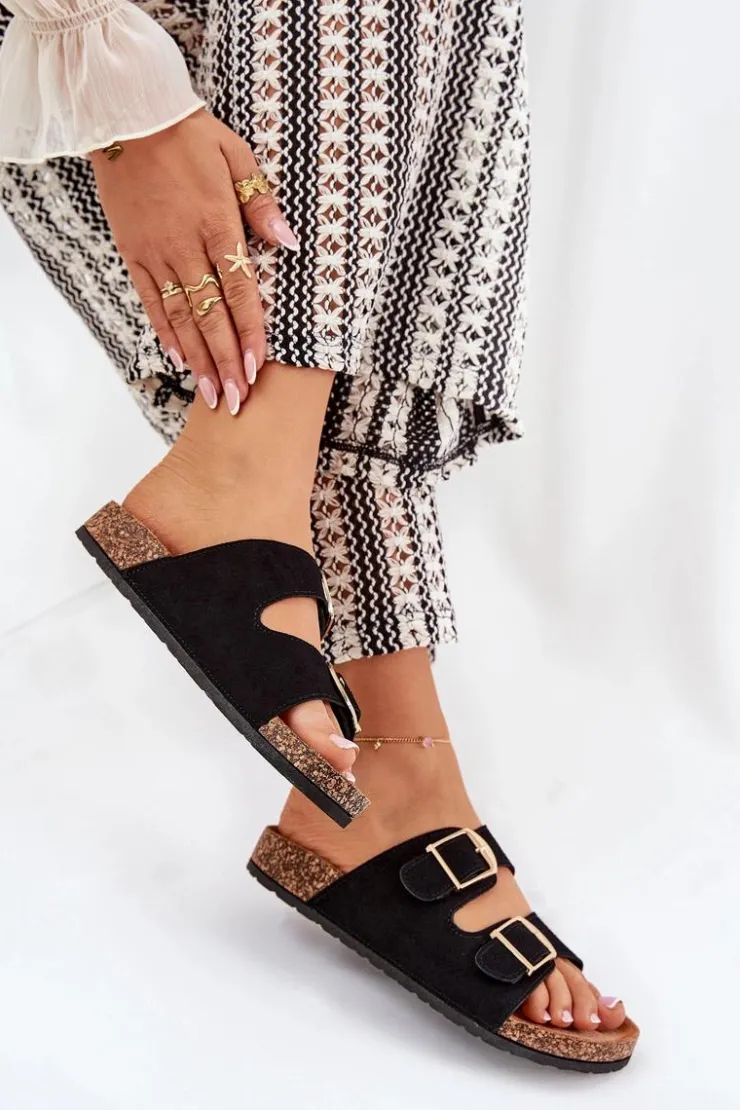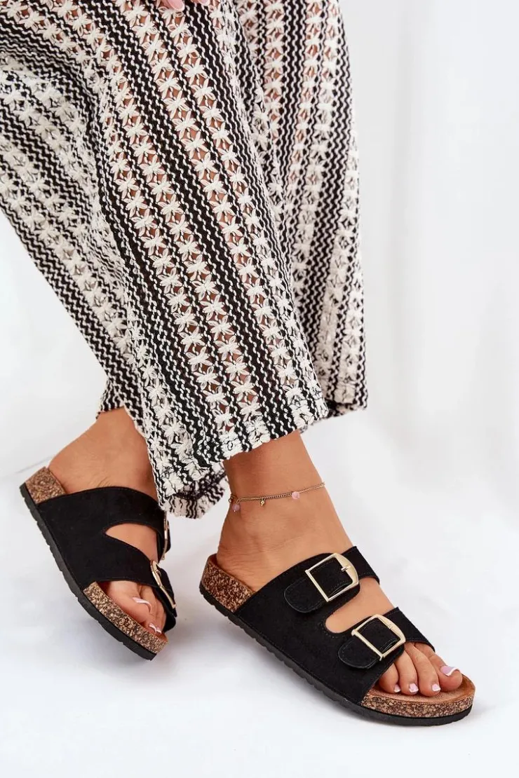 Stylowe klapki damskie na korkowej platformie, które łączą wygodę z modnym wyglądem. Z przodu znajdują się dwa paski z klamrami, które zapewniają idealne dopasowanie. Profilowana eko zamszowa wkładka gwarantuje komfort przez cały dzień. Te klapki będą doskonałym wyborem na letnie dni, świetnie komponując się z sukienkami, spódnicami i spodniami. Przy wyborze rozmiaru prosimy sugerować się tabelą rozmiarów.