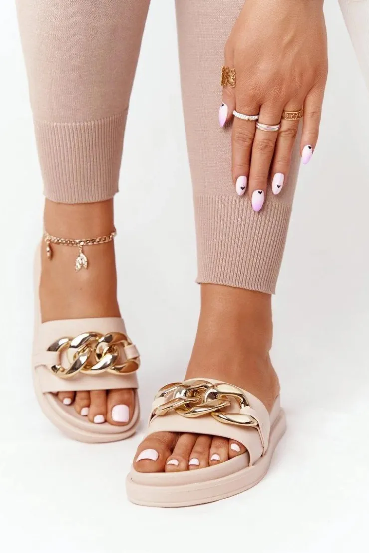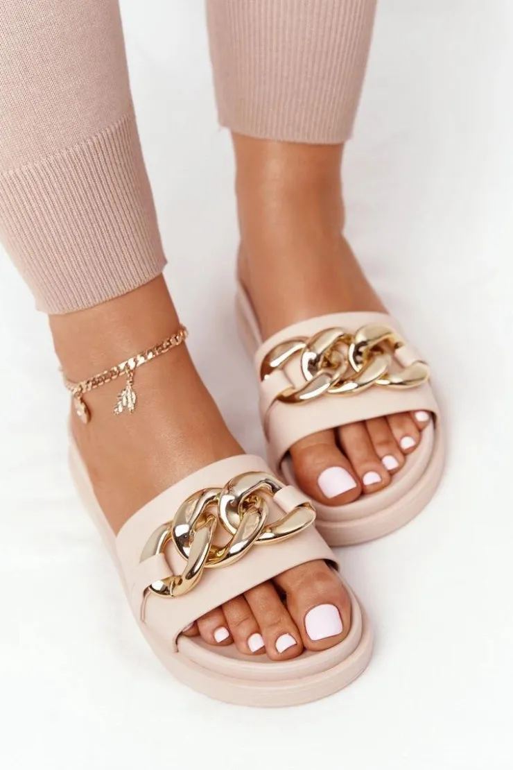 Wygodne klapki na platformie ozdobione modnym łańcuchem w kolorze złotym. Klapki to świetna propozycja dla kobiet ceniących sobie komfort w letnie dni! Cholewka wykonana jest z eko skóry. Koniecznie sprawdź całą naszą kolekcje klapek damskich! Przy wyborze rozmiaru prosimy sugerować się tabelą rozmiarów.
